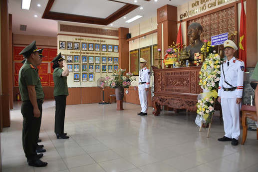 Đoàn công tác của Học viện và đại diện học viên lớp học dâng hương, dâng hoa tại Phòng thờ Chủ tịch Hồ Chí Minh trong khuôn viên Công an tỉnh Quảng Nam