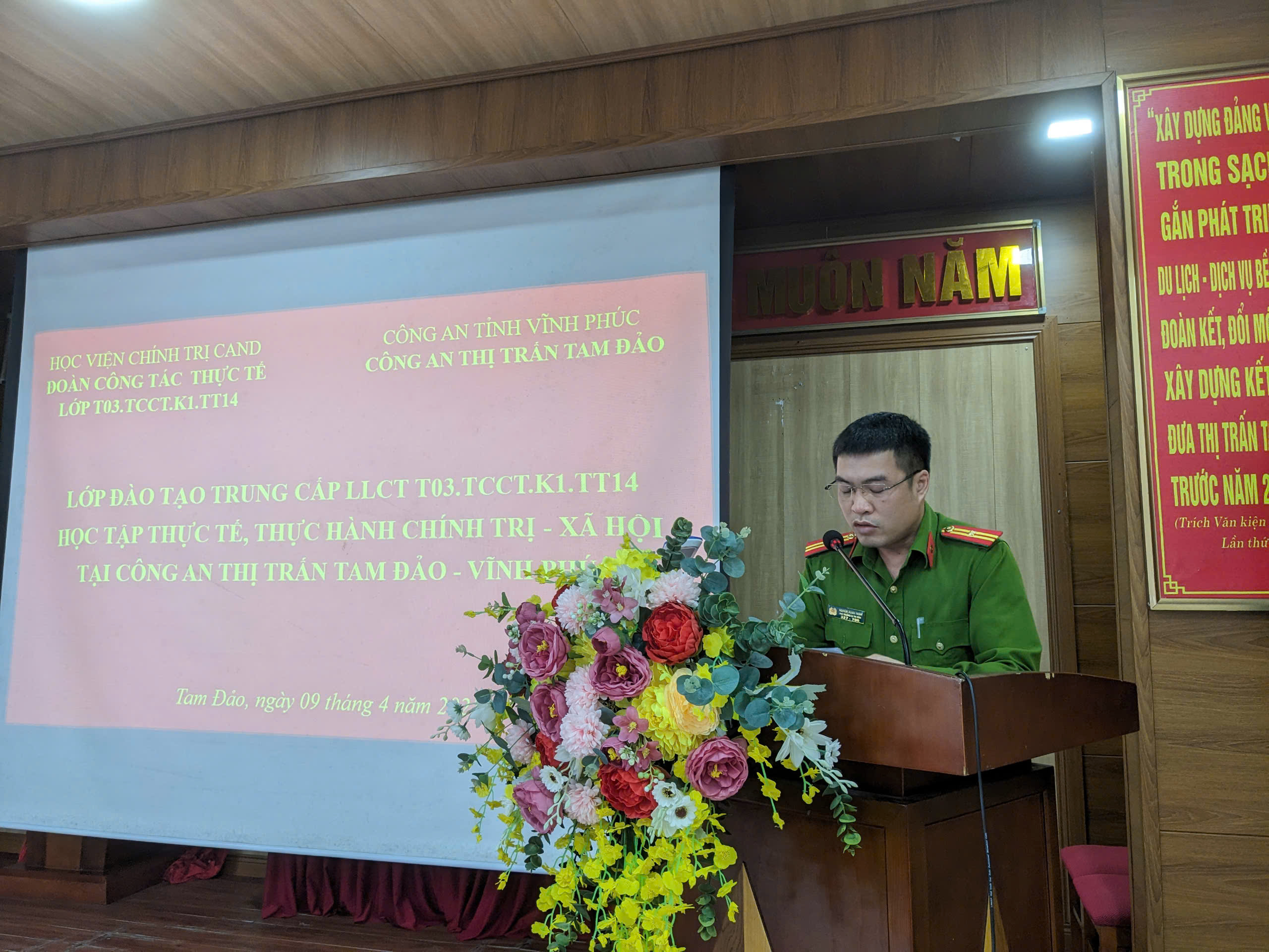 Đồng chí Thiếu tá Nghiêm Xuân Thịnh, Phó Trưởng Công an thị trấn Tam Đảo thay mặt Công an thị trấn Tam Đảo cảm ơn Học viện Chính trị CAND đã tin tưởng, lựa chọn Công an thị trấn Tam Đảo, tỉnh Vĩnh Phúc là điểm đến để tổ chức học tập thực tế, thực hành chính trị - xã hội cho học viên lớp đào tạo trung cấp lý luận chính trị, T03.TCCT.K1.TT14.