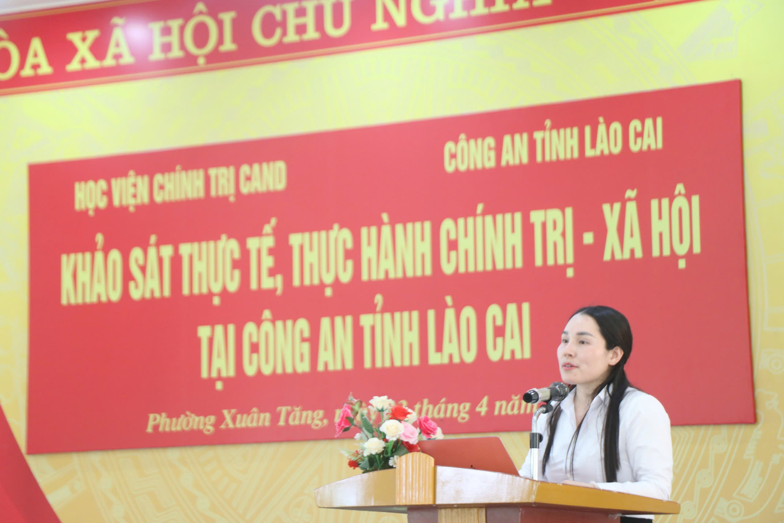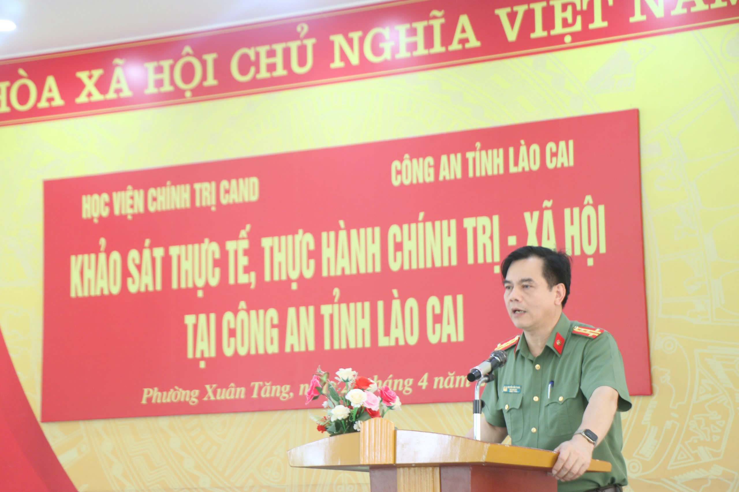 Tại buổi làm việc, đồng chí Giám đốc Học viện đã cảm ơn sự quan tâm, phối hợp, tạo điều kiện của Đảng ủy, Ban Giám đốc Công an tỉnh Lào Cai và các đơn vị chức năng, đặc biệt và chính quyền địa phương đối với đoàn công tác. Tiếp đó, đồng chí Trưởng đoàn đã quán triệt mục đích, yêu cầu, định hướng những nội dung tổ chức học tập thực tế, thực hành chính trị - xã hội. Theo đó, đồng chí đề nghị học viên lớp học tích cực trao đổi, đóng góp ý kiến về các nội dung đã được báo cáo viên trình bày để cùng trao đổi kinh nghiệm thực tế, làm rõ hơn các nội dung báo cáo, góp phần làm phong phú, sinh động hơn cho buổi làm việc, góp phần xây dựng lực lượng Công an nhân dân thật sự trong sạch, vững mạnh, chính quy, tinh nhuệ, hiện đại.