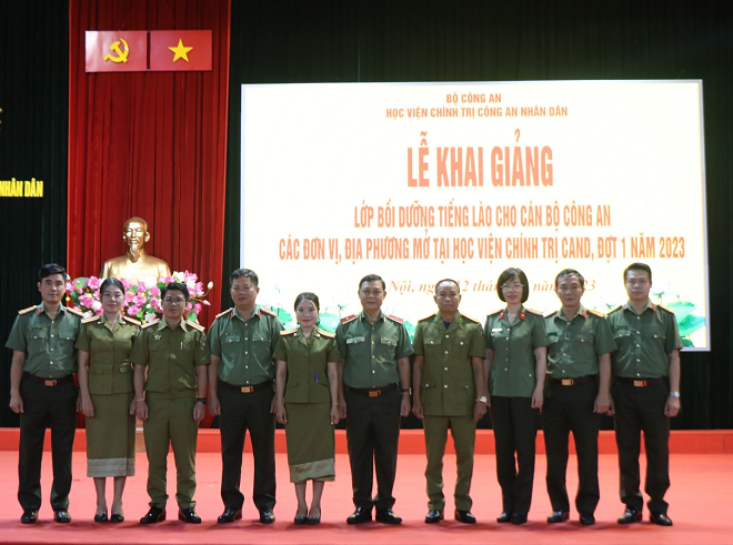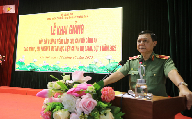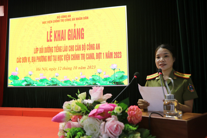 Thực hiện nhiệm vụ Lãnh đạo Bộ Công an giao, căn cứ Kế hoạch số 2171/KH-T03-P3 ngày 10/10/2023 của Học viện Chính trị CAND về việc tổ chức Lễ khai giảng lớp bồi dưỡng tiếng Lào cho công an các đơn vị, địa phương. Sáng ngày 12/10/2023, Học viện Chính trị CAND trang trọng tổ chức Lễ Khai giảng lớp Bồi dưỡng tiếng Lào cho 100 cán bộ Công an đến từ 25 đơn vị, địa phương. Đồng chí Thiếu tướng, TS Nguyễn Như Lôi, Ủy viên Ban thường vụ Đảng ủy, Phó Giám đốc Học viện chủ trì buổi lễ; tham dự Lễ Khai giảng có đồng chí Đại tá Phan Văn Mỹ, Ủy viên Ban thường vụ Đảng ủy, Phó Cục trưởng Cục Đào tạo, các đơn vị chức năng thuộc Cục Đào tạo, Cục Đối ngoại, Học viện Chính trị CAND cùng toàn thể học viên lớp học.