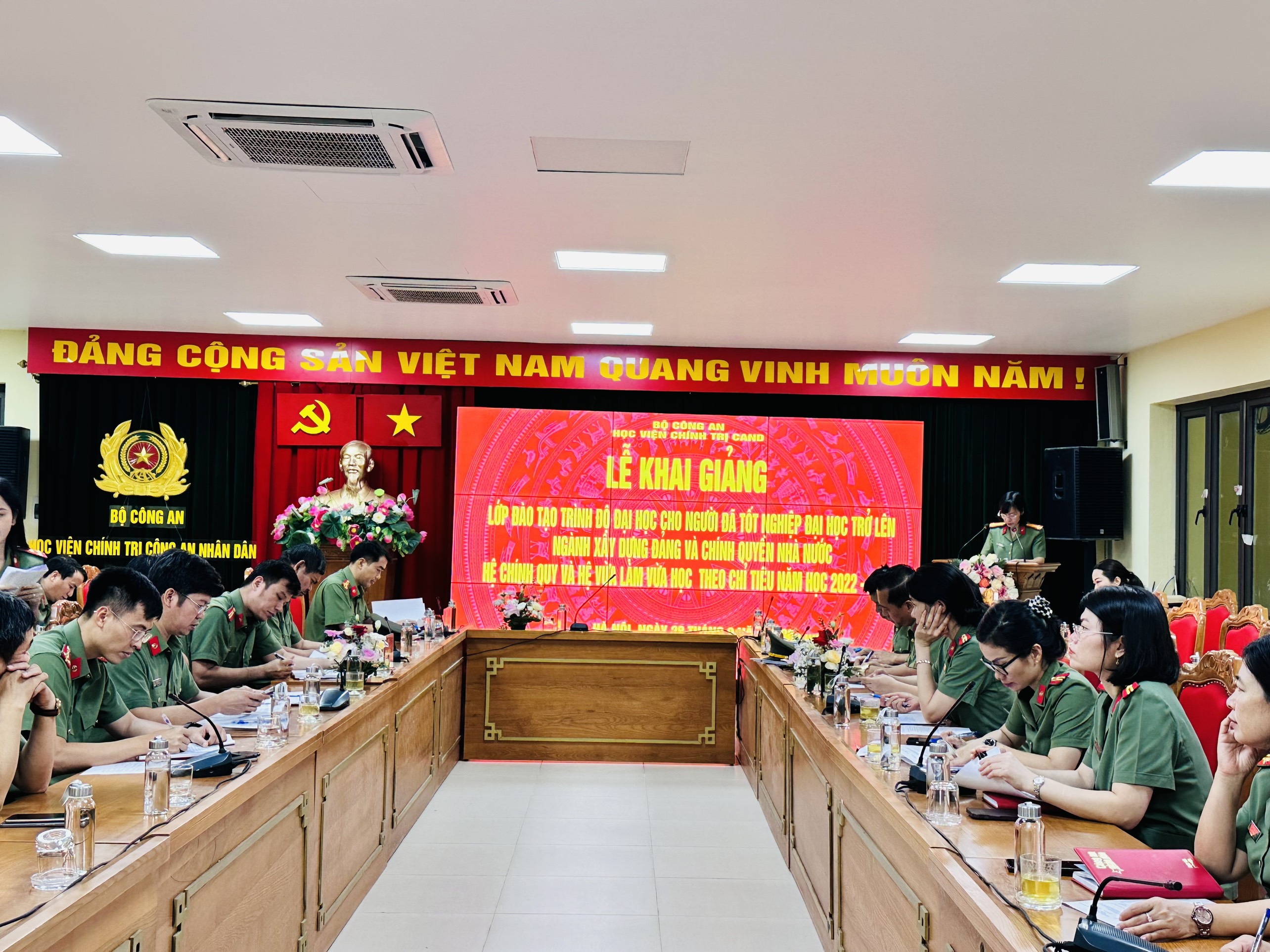 Thực hiện Kế hoạch số 2018/KH-T03-P6 ngày 25/9/2023 của Học viện Chính trị CAND về việc tổ chức Lễ Khai giảng lớp đào tạo trình độ đại học cho người đã tốt nghiệp trình độ đại học trở lên hệ chính quy và hệ vừa làm vừa học theo chỉ tiêu năm học 2022-2023, sáng ngày 28/9/2023, Học viện trang trọng tổ chức Lễ Khai giảng khoá học. Đồng chí Thượng tá, TS Nguyễn Văn Tuấn, Phó đốc Học viện Chính trị Công an nhân chủ trì buổi lễ; tham dự Lễ Khai giảng có lãnh đạo các đơn vị chức năng thuộc Học viện cùng toàn thể học viên lớp học.