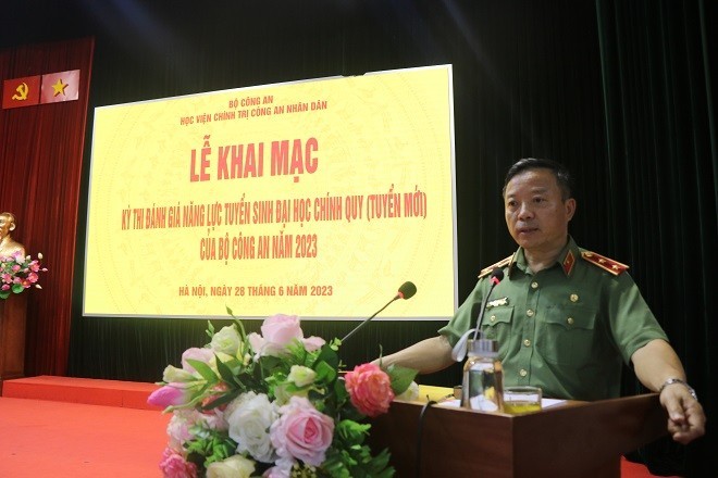Phát biểu tại buổi lễ, đồng chí Trung tướng, PGS. TS Phan Xuân Tuy, Giám đốc Học viện cho biết: Kỳ thi đánh giá năng lực do Bộ Công an tổ chức thu hút sự quan tâm và có hàng chục nghìn thí sinh tham gia thi mỗi đợt; trong đó, năm 2023, số lượng thí sinh đăng ký dự thi tại Học viện Chính trị CAND có sự tăng vọt về số lượng (gấp 6 lần năm 2022). Do đó, để chuẩn bị chu đáo cho kỳ thi, đồng chí Giám đốc Học viện, Chủ tịch Hội đồng tuyển sinh yêu cầu các Ban gúp việc Hội đồng thi cùng toàn thể cán bộ, giảng viên, công nhân viên Học viện nêu cao tinh thần trách nhiệm, thực hiện chặt chẽ, nghiêm túc các quy định, quyết tâm hoàn thành tốt các nhiệm vụ được phân công để kỳ thi diễn ra an toàn, nghiêm túc, công bằng, đúng quy chế, kiên quyết không để xảy ra sai phạm, sai sót dù nhỏ nhất, để góp phần vào thành công chung của kỳ thi do Bộ Công an tổ chức với yêu cầu của một kỳ thi nghiêm túc, chuẩn mực cao. Do đó, yêu cầu việc chuẩn bị cơ sở vật chất đầy đủ, triển khai tốt các phương án bảo mật đề thi và quản lý bài thi cũng như chủ động phương án ứng phó nhiều tình huống khác như thiên tai, bão lũ, bảo vệ chăm sóc sức khỏe cho thí sinh; phương án bảo vệ, kiểm soát an ninh tuyệt đối; phòng chống gian lận trong thi cử vào bảo đảm an toàn người, phương tiện, đồ vật của thí sinh và người nhà thí sinh.