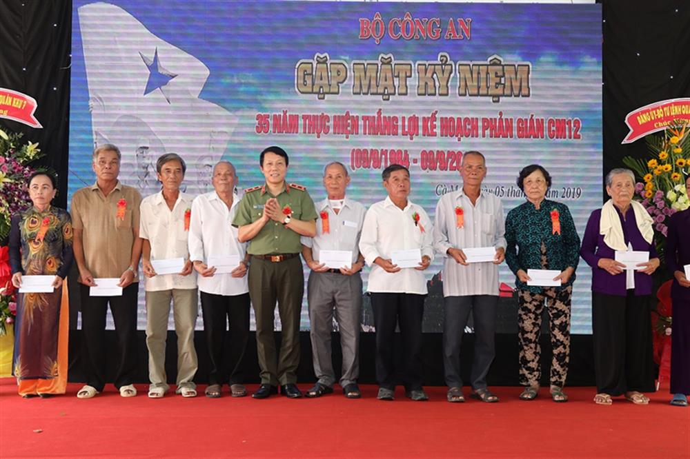 Trung tướng Lương Tam Quang, Uỷ viên Trung ương Đảng, Thứ trưởng Bộ Công an (nay là Thượng tướng, Uỷ viên Bộ Chính trị, Bộ trưởng Bộ Công an) tặng quà đại diện các gia đình đã trực tiếp nuôi cán bộ Công an tại buổi Gặp mặt kỷ niệm 35 năm thực hiện thắng lợi Kế hoạch phản gián CM12 (ngày 05/9/2019)