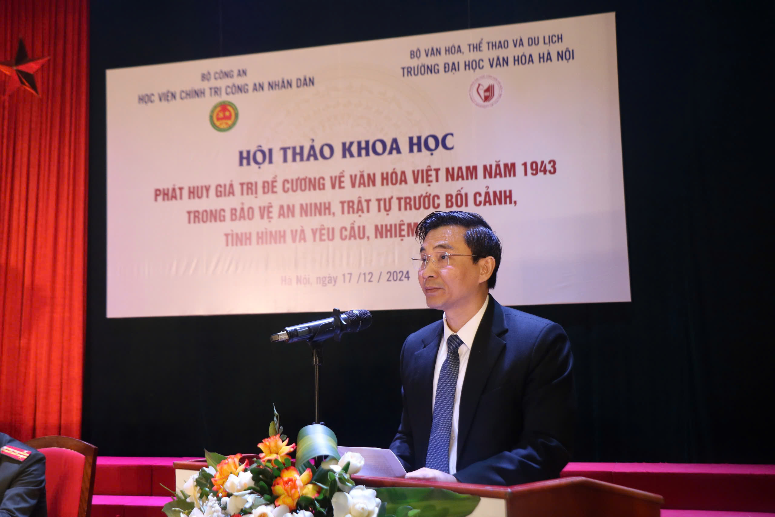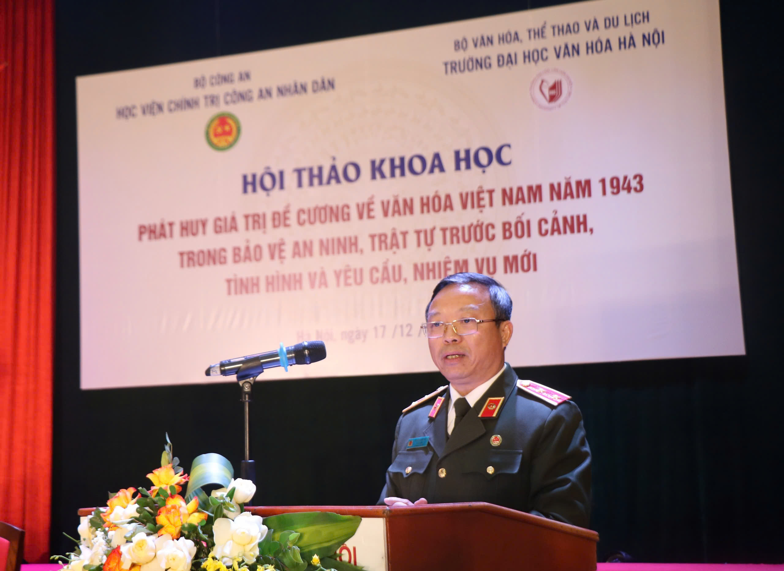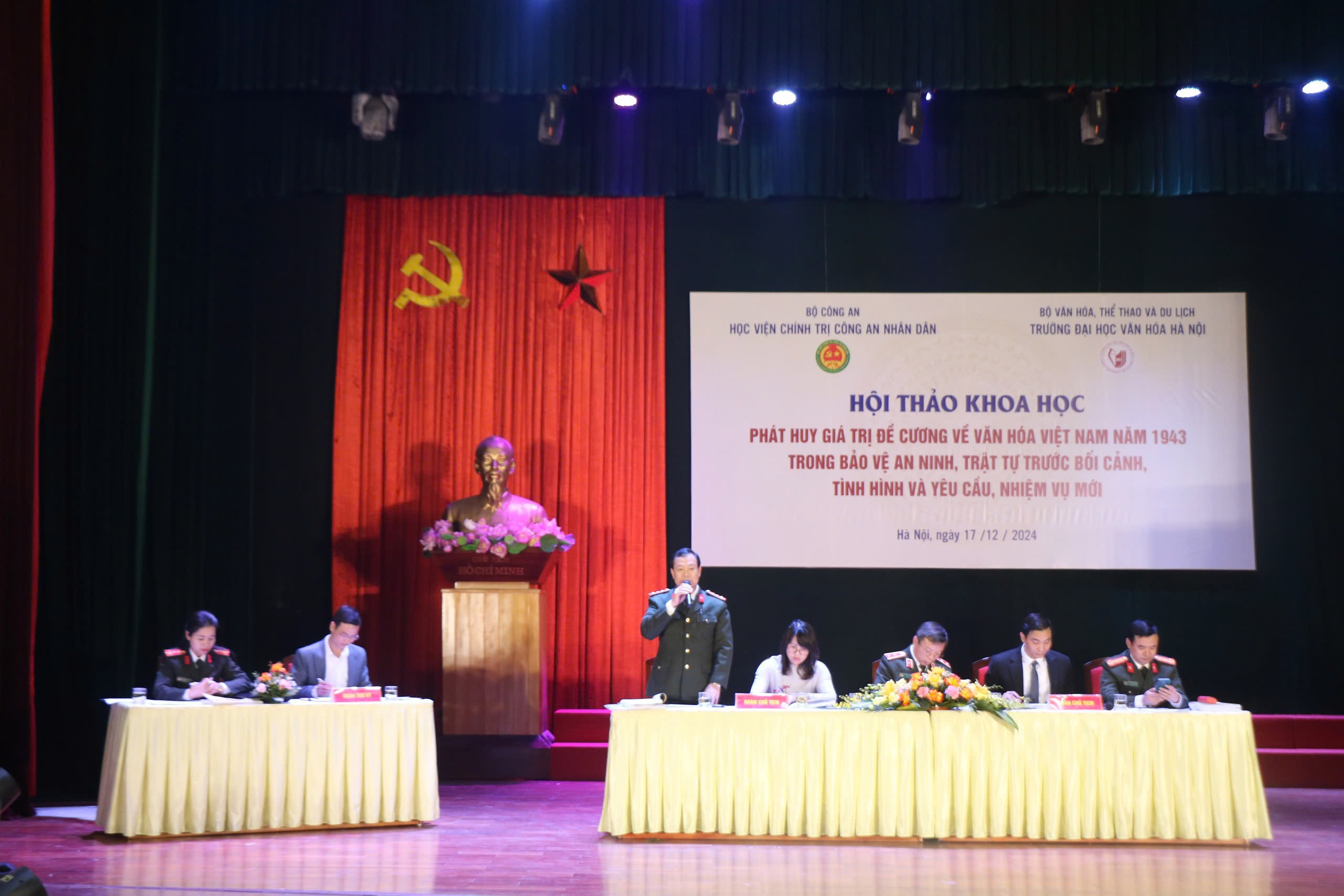 Phát biểu tổng kết tại Hội thảo, Trung tướng, PGS.TS Phan Xuân Tuy, Giám đốc Học viện Chính trị CAND nhấn mạnh: Đề cương về văn hoá Việt Nam năm 1943 không chỉ là một tài liệu quan trọng trong việc xây dựng nền văn hóa mới mà còn đóng vai trò quan trọng trong công tác bảo vệ ANTT và xây dựng lực lượng CAND. Những giá trị lý luận và thực tiễn của Đề cương vẫn giữ nguyên giá trị và tính ứng dụng cao trong bối cảnh hiện nay, đặc biệt trong việc bảo vệ bản sắc văn hóa dân tộc, nâng cao bản lĩnh chính trị, phẩm chất đạo đức tư cách người Công an cách mạng và đối phó với các thách thức trong công tác bảo vệ ANQG, bảo đảm trật tự an toàn xã hội. Trước yêu cầu nhiệm vụ cách mạng, nhiệm vụ của lực lượng Công an trong thời kỳ mới đặt ra ngày càng cao và để quyết tâm thực hiện thắng lợi chủ trương của Đảng tại Đại hội đại biểu toàn quốc lần thứ XIII và Nghị quyết số 12-NQ/TW ngày 16/3/2022 của Bộ Chính trị về “Đẩy mạnh xây dựng lực lượng CAND thật sự trong sạch, vững mạnh, chính quy, tinh nhuệ, hiện đại, đáp ứng yêu cầu, nhiệm vụ trong tình hình mới”, cần tiếp tục tiếp thu những chỉ dẫn của Đề cương về Văn hóa Việt Nam cùng các quan điểm của Đảng và Chủ tịch Hồ Chí Minh để xây dựng các giá trị văn hóa CAND trong tình hình mới