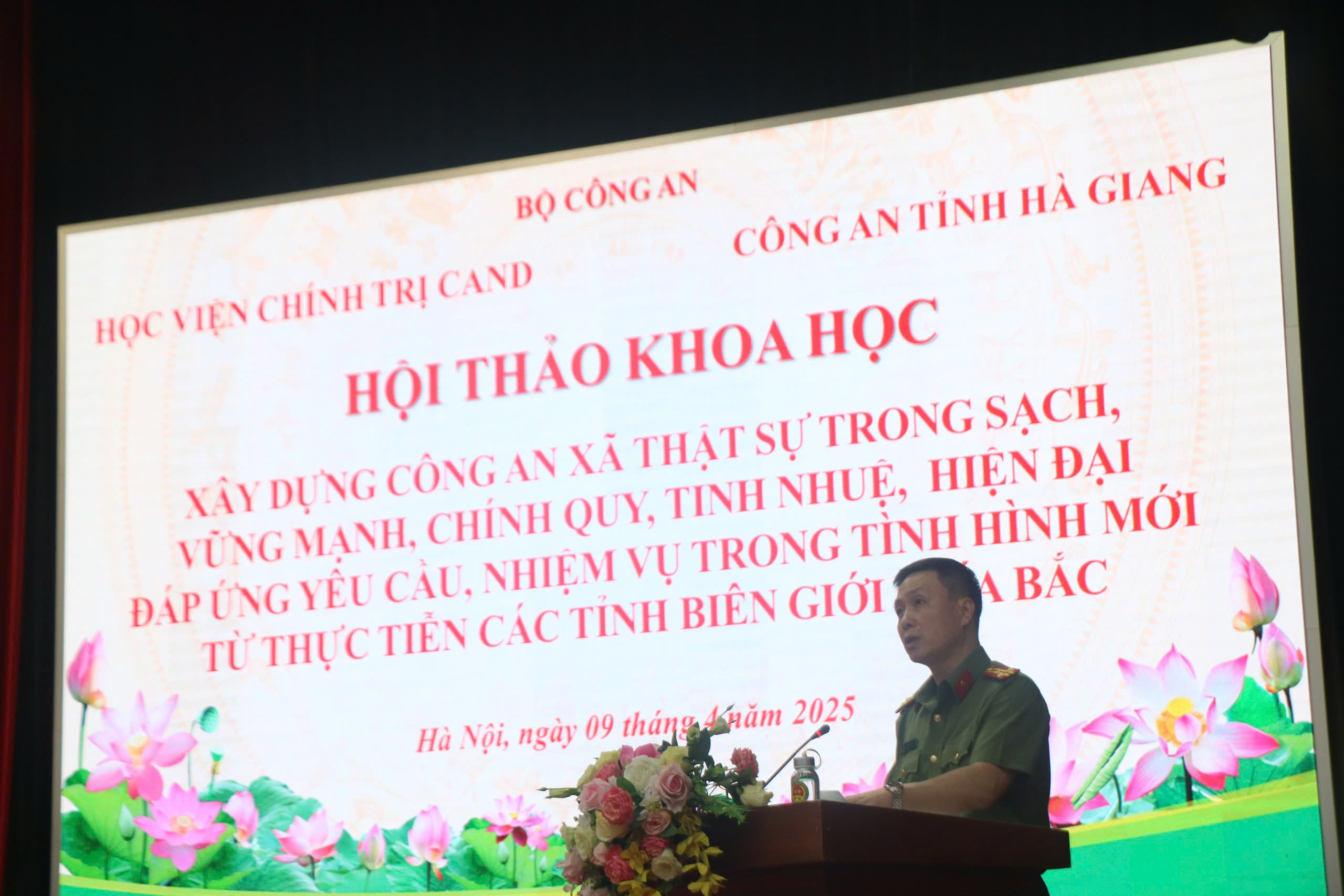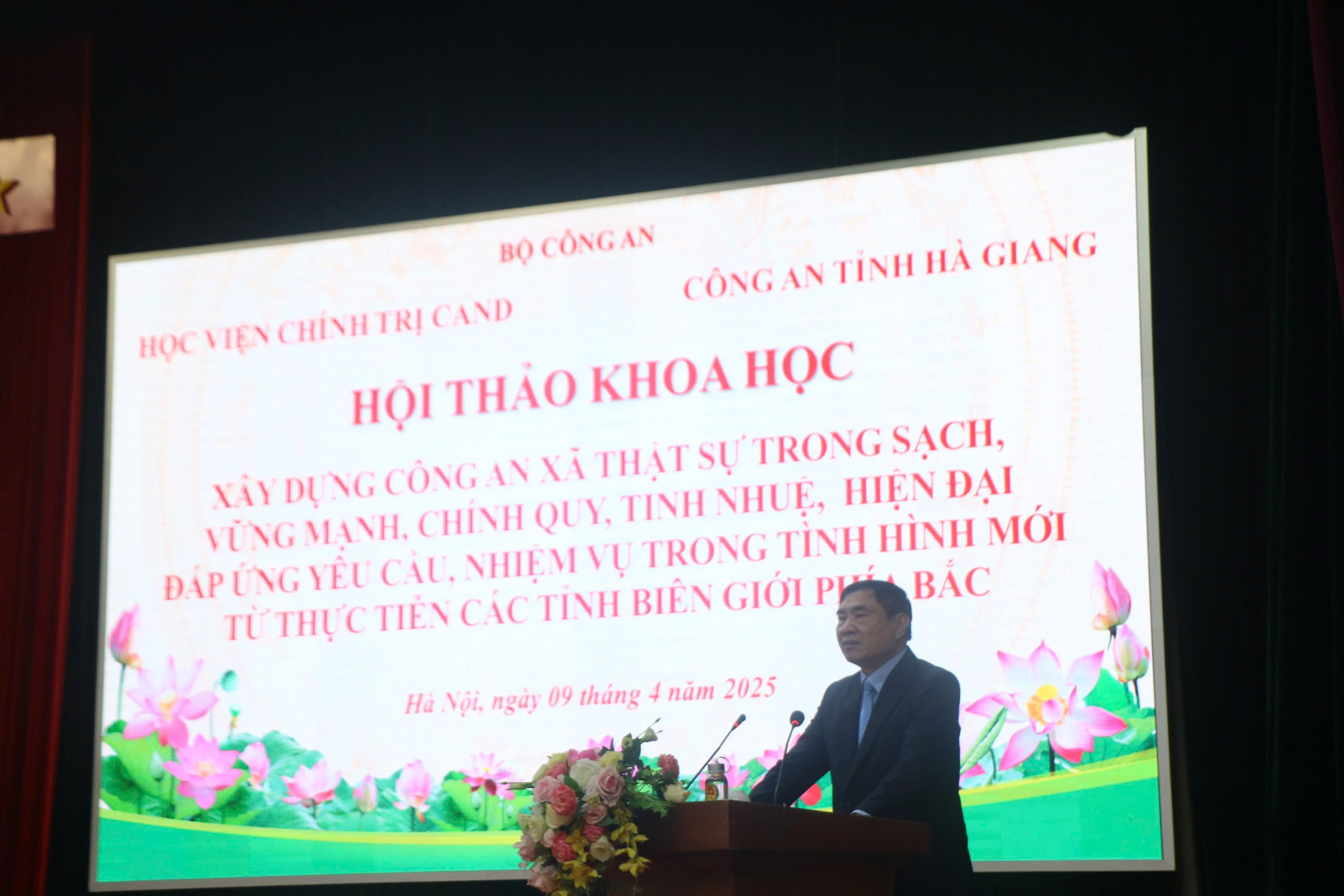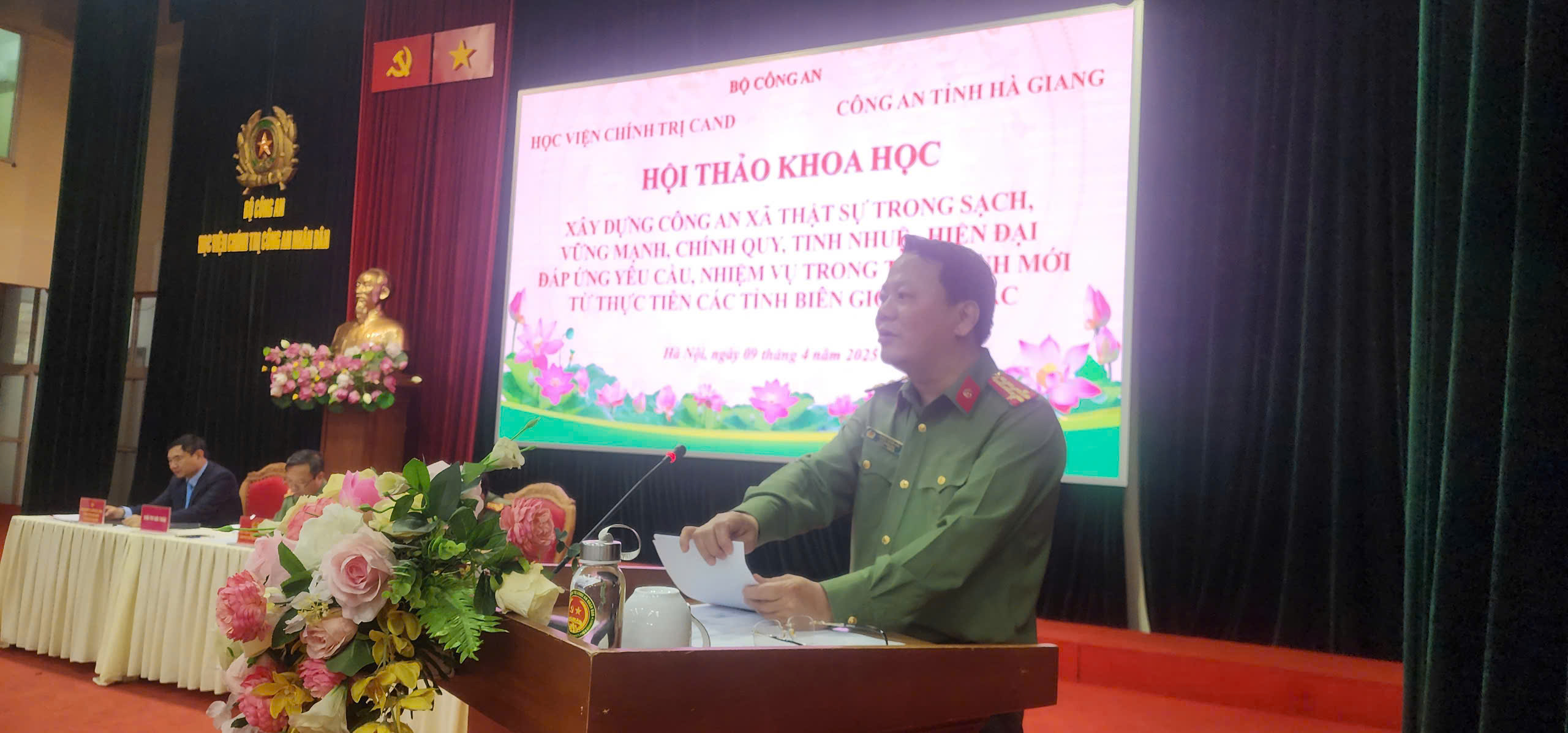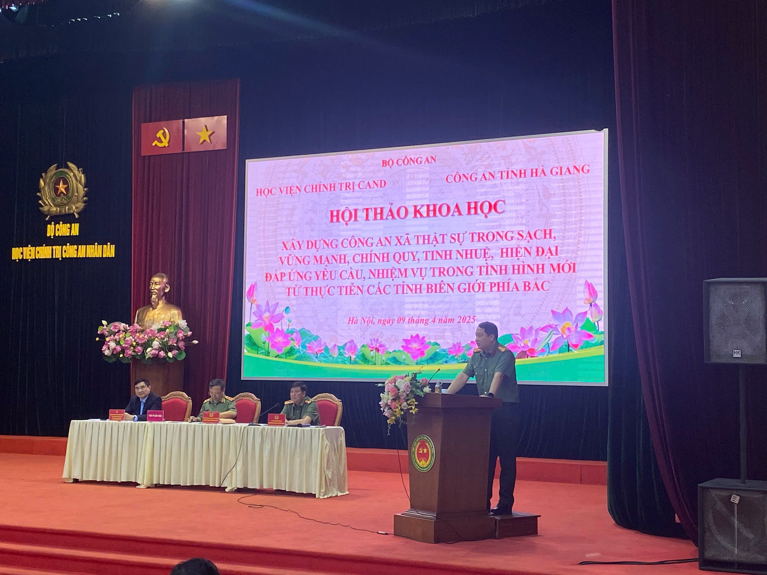 Ngày 09/4/2025, Học viện Chính trị Công an nhân dân phối hợp với Công an tỉnh Hà Giang tổ chức hội thảo khoa học với chủ đề: “Xây dựng Công an xã thật sự trong sạch, vững mạnh, chính quy, tinh nhuệ, hiện đại đáp ứng yêu cầu, nhiệm vụ trong tình hình mới - Từ thực tiễn các tỉnh biên giới phía Bắc” nhằm trao đổi, phân tích, đánh giá kết quả thực hiện nhiệm vụ xây dựng Công an xã thật sự trong sạch, vững mạnh, chính quy, tinh nhuệ, hiện đại đáp ứng yêu cầu nhiệm vụ trong tình hình mới trên địa bàn các tỉnh biên giới phía Bắc theo tinh thần Nghị quyết số 12-NQ/TW của Bộ Chính trị, Kết luận số 121-KL/TW ngày 24/1/2025 về tổng kết Nghị quyết số 18-NQ/TW năm 2017 của Ban Chấp hành Trung ương Đảng khóa XII về Một số vấn đề về tiếp tục đổi mới, sắp xếp tổ chức bộ máy của hệ thống chính trị tinh gọn, hoạt động hiệu lực, hiệu quả; Kết luận số 126-KL/TW ngày 14/02/2025 của Bộ Chính trị về một số nội dung, nhiệm vụ tiếp tục sắp xếp, tinh gọn tổ chức bộ máy của hệ thống chính trị năm 2025; Đề án số 25 của Đảng ủy Công an Trung ương về “Tiếp tục sắp xếp, tinh gọn tổ chức bộ máy Công an địa phương hoạt động hiệu lực, hiệu quả, đáp ứng yêu cầu, nhiệm vụ trong thời kỳ mới”. Các đồng chí: PGS.TS Trần Quốc Cường, Ủy viên Ban Chấp hành Trung ương Đảng, Bí thư Tỉnh ủy Điện Biên; Trung tướng, PGS.TS, NGƯT Phan Xuân Tuy, Ủy viên Hội đồng lý luận Bộ Công an, Giám đốc Học viện Chính trị Công an nhân dân; Đại tá Hoàng Văn Mạnh, Phó Bí thư Đảng ủy, Phó Giám đốc Công an tỉnh Hà Giang tham dự và Đồng chủ trì hội thảo.