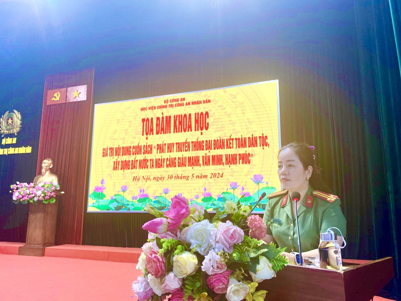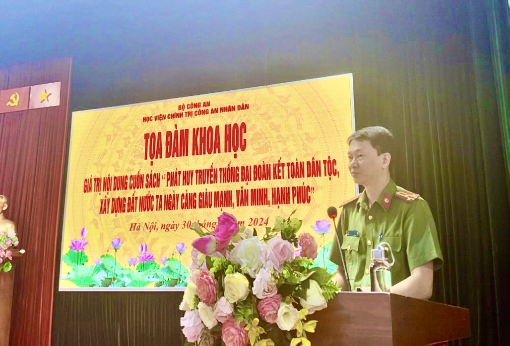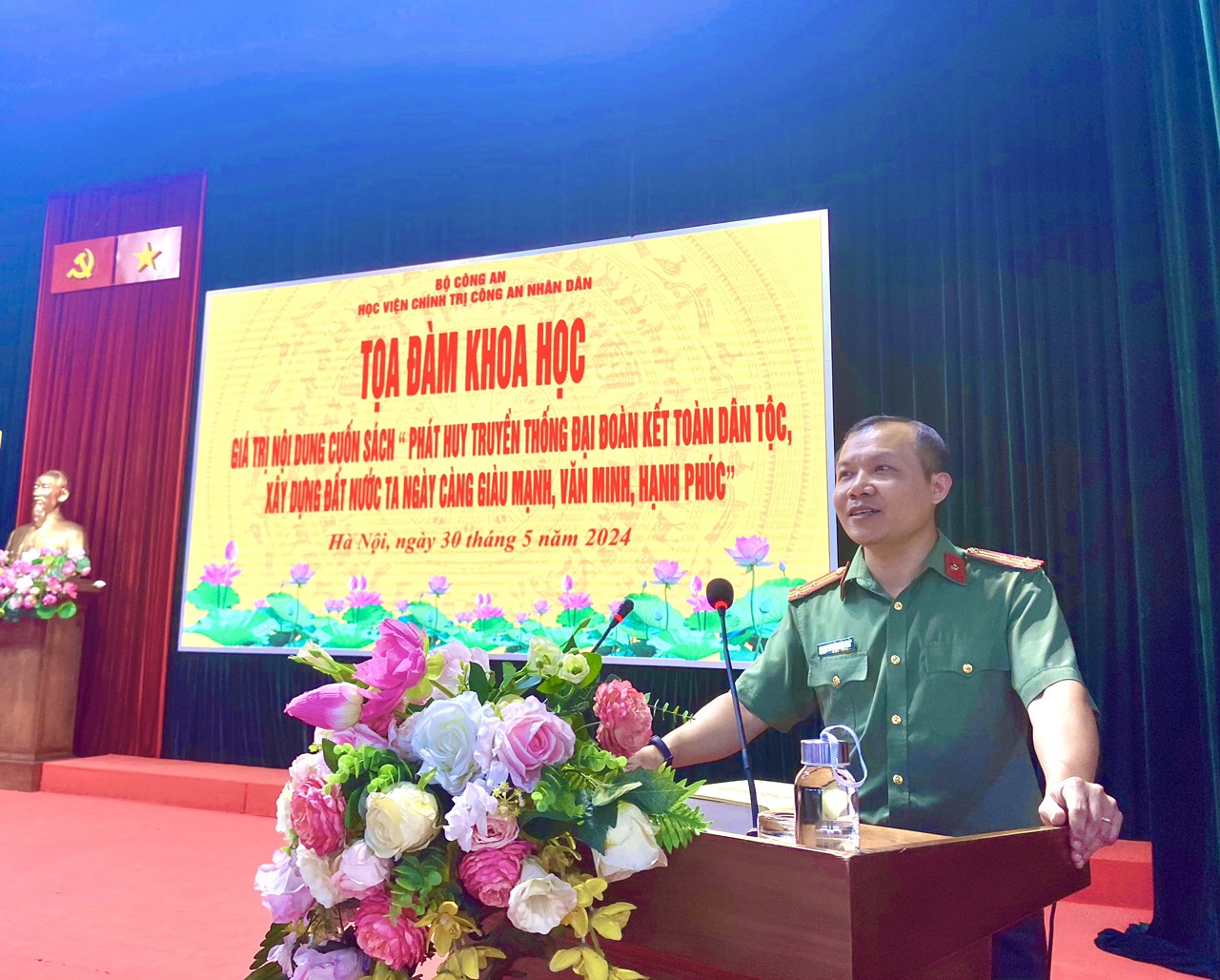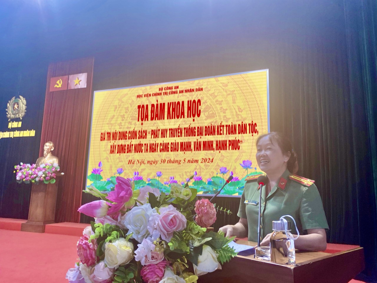 Thực hiện chương trình Kế hoạch, chương trình công tác nghiên cứu khoa học năm học 2023 - 2024 của Học viện Chính trị Công an nhân dân, chiều ngày 30/5/2024, tại Hội trường trung tâm, Học viện Chính trị Công an nhân dân đã tổ chức Tọa đàm khoa học cấp Học viện Giá trị nội dung cuốn sách “Phát huy truyền thống đại đoàn kết toàn dân tộc, xây dựng đất nước ta ngày càng giàu mạnh, văn minh, hạnh phúc” của Tổng Bí thư Nguyễn Phú Trọng.