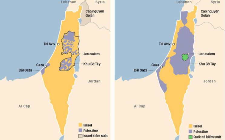 Lãnh thổ Israel - Palestine hiện nay (trái) và do Liên Hợp Quốc đề xuất năm 1947.