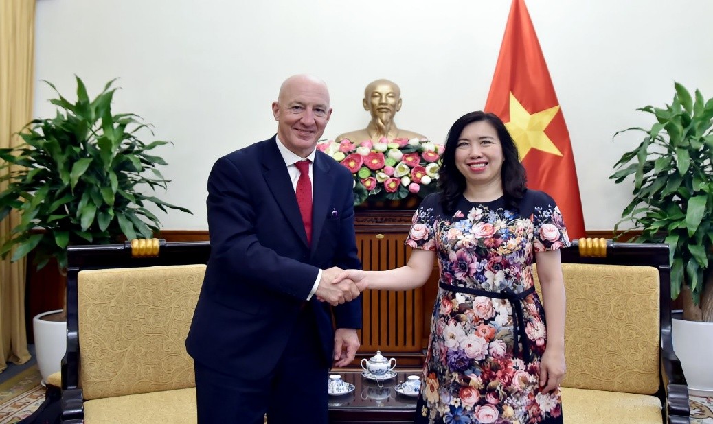 Thứ trưởng Lê Thị Thu Hằng tiếp ông Mark Kent Chủ tịch Mạng lưới Hữu nghị Việt Nam – Anh. Nguồn: mofa.gov.vn