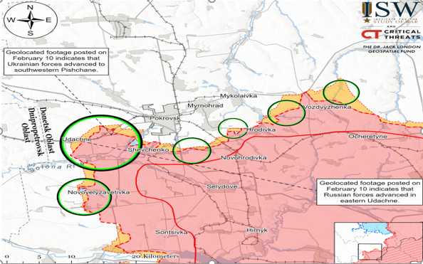 Bản đồ chiến sự Nga - Ukraine tại vùng Donetsk ngày 10/2 với tâm điểm Pokrovsk. Trong đó, Moscow kiểm soát khu vực màu hồng, những vòng tròn thể hiện các mặt trận, kích thước càng lớn càng nóng bỏng. Các khu vực màu vàng là nơi họ mới giành được (Ảnh: ISW).