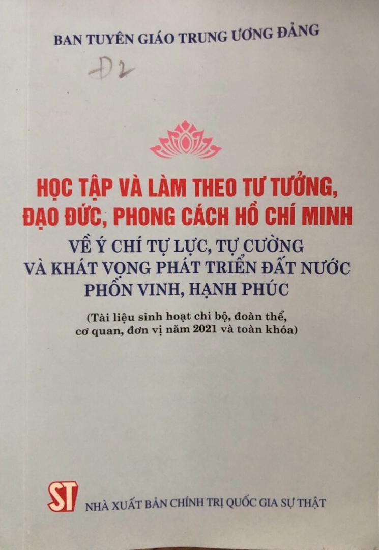 Thực hiện Kết luận số 01-KL/TW, ngày 18/5/2021 của Bộ Chính trị về tiếp tục thực hiện Chỉ thị số 05-CT/TW, ngày 15/5/2016 của Bộ Chính trị khóa XII “về đẩy mạnh học tập và làm theo tư tưởng, đạo đức, phong cách Hồ Chí Minh”; tiếp tục thực hiện Kế hoạch số 03-KH/TW, ngày 25/7/2016 của Ban Bí thư Trung ương Đảng về thực hiện Chỉ thị số 05-CT/TW, ngày 15/5/2016 của Bộ Chính trị “về đẩy mạnh học tập và làm theo tư tưởng, đạo đức, phong cách Hồ Chí Minh”, quyết tâm thực hiện thắng lợi Nghị quyết Đại hội XIII của Đảng, Ban Tuyên giáo Trung ương Đảng tổ chức biên soạn và phối hợp với Nhà xuất bản Chính trị quốc gia Sự thật xuất bản chuyên đề: Học tập và làm theo tư tưởng đạo đức, phong cách Hồ Chí Minh về ý chí tự lực, tự cường và khát vọng phát triển đất nước phồn vinh, hạnh phúc (Tài liệu sinh hoạt chi bộ, đoàn thế, cơ quan, đơn vị năm 2021 và toàn khóa).
