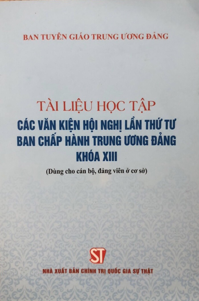 Để giúp các cấp, các ngành học tập, quán triệt và triển khai thực hiện Nghị quyết Hội nghị lần thứ tư Ban Chấp hành Trung ương Đảng khóa XIII, Ban Tuyên giáo Trung ương Đảng tổ chức biên soạn, phối hợp với Nhà xuất bản Chính trị quốc gia Sự thật xuất bản các tài liệu: Tài liệu học tập các văn kiện Hội nghị lần thứ tư Ban Chấp hành Trung ương Đảng khóa XIII (Dùng cho cán bộ, đảng viên ở cơ sở); Tài liệu hỏi - đáp về các văn kiện Hội nghị lần thứ tư Ban Chấp hành Trung ương Đảng khóa XIII (Dùng cho đoàn viên, hội viên các tổ chức chính trị - xã hội và tuyên truyền trong nhân dân); Tài liệu nghiên cứu các văn kiện Hội nghị lần thứ tư Ban Chấp hành Trung ương Đảng khóa XIII (Dùng cho cán bộ chủ chốt và báo cáo viên),