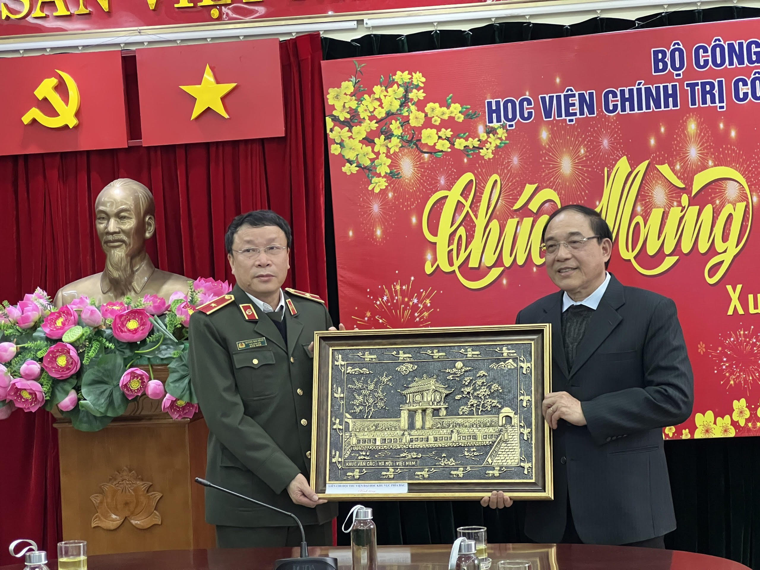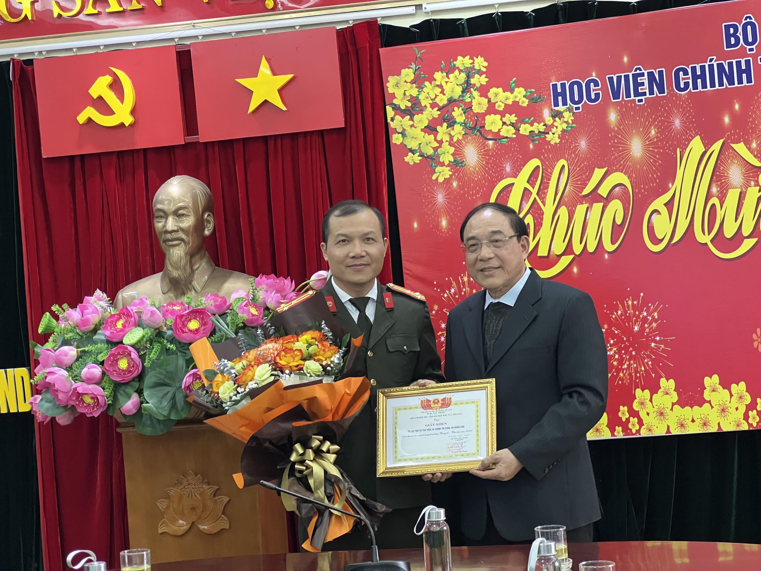 Cũng tại buổi làm việc, TS Nguyễn Huy Chương đã tặng quà lưu niệm của Liên Chi hội cho Học viện và tặng giấy khen cho Trung tâm Lưu trữ và Thư viện - Học viện Chính trị Công an nhân dân vì có thành tích xuất sắc và có nhiều đóng góp trong khuôn khổ các hoạt động do Liên Chi hội thư viện đại học khu vực phía Bắc tổ chức.
