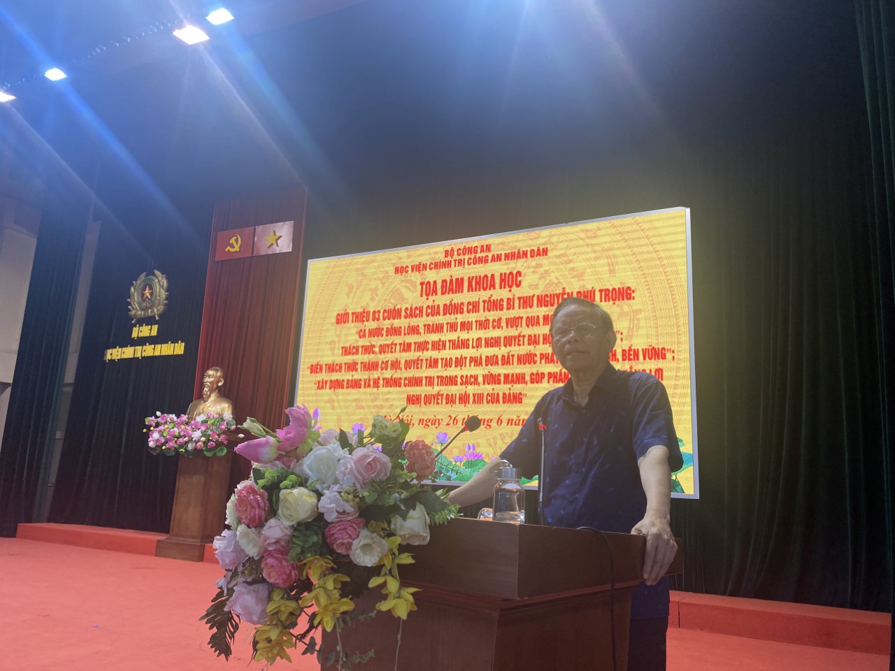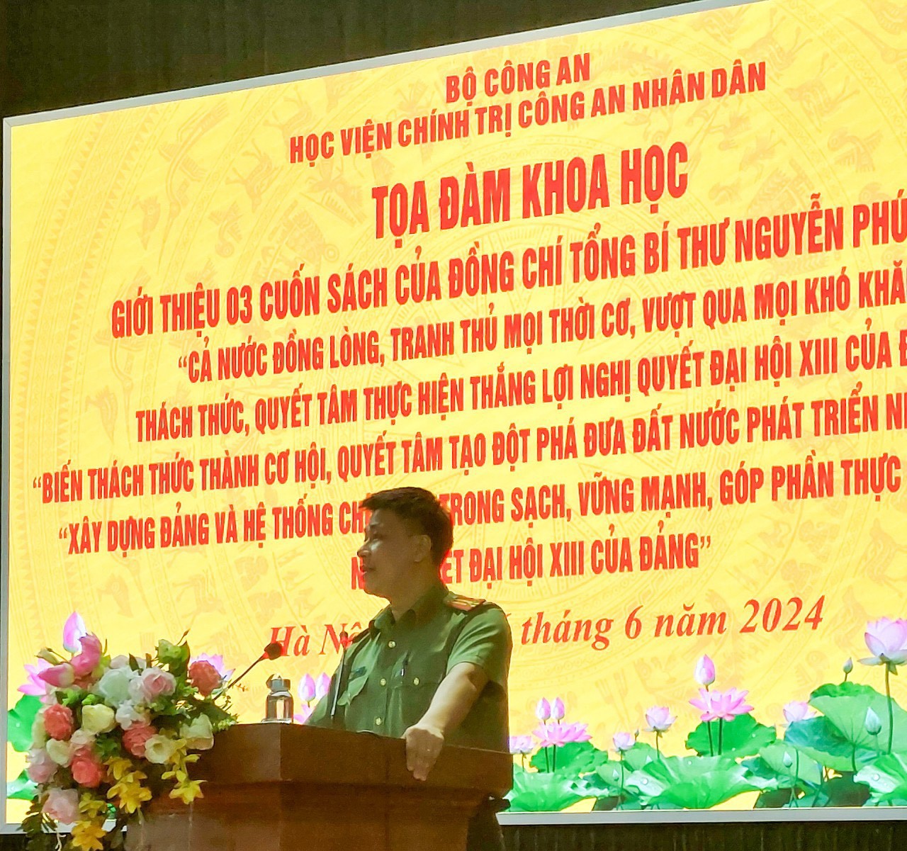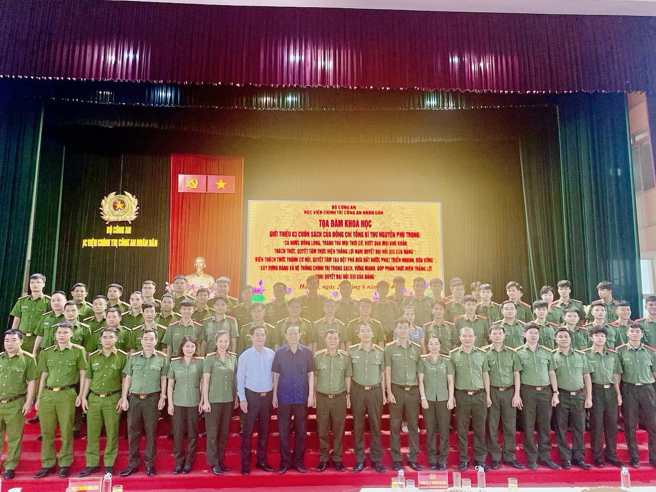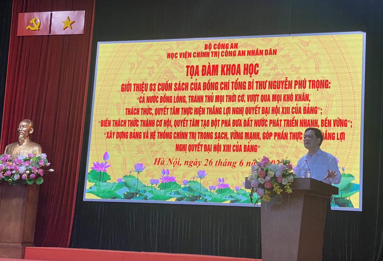 Ngày 26/6/2024, Học viện Chính trị Công an nhân dân tổ chức Tọa đàm giới thiệu 03 cuốn sách của đồng chí Tổng Bí thư Nguyễn Phú Trọng gồm: “Xây dựng Đảng và hệ thống chính trị trong sạch, vững mạnh góp phần thực hiện thắng lợi Nghị quyết đại hội XIII của Đảng”; “Biến thách thức thành cơ hội - Quyết tâm tạo đột phá đưa đất nước phát triển nhanh, bền vững” và “Cả nước đồng lòng, tranh thủ mọi thời cơ, vượt qua mọi khó khăn, thách thức, quyết tâm thực hiện thắng lợi Nghị quyết Đại hội XIII của Đảng”. Đồng chí Thượng tá, TS Nguyễn Văn Tuấn, Phó Giám đốc Học viện chủ trì Tọa đàm. Tham dự Tọa đàm có đồng chí PGS.TS Nguyễn Hồng Vinh, nguyên Ủy viên Trung ương Đảng, nguyên Tổng Biên tập Báo Nhân dân, nguyên Phó Trưởng Ban Thường trực Ban Tuyên giáo Trung ương; TS Nhị Lê, nguyên Phó Tổng biên tập Tạp chí Cộng sản; đại diện lãnh đạo các đơn vị và cán bộ, giảng viên, học viên của Học viện.