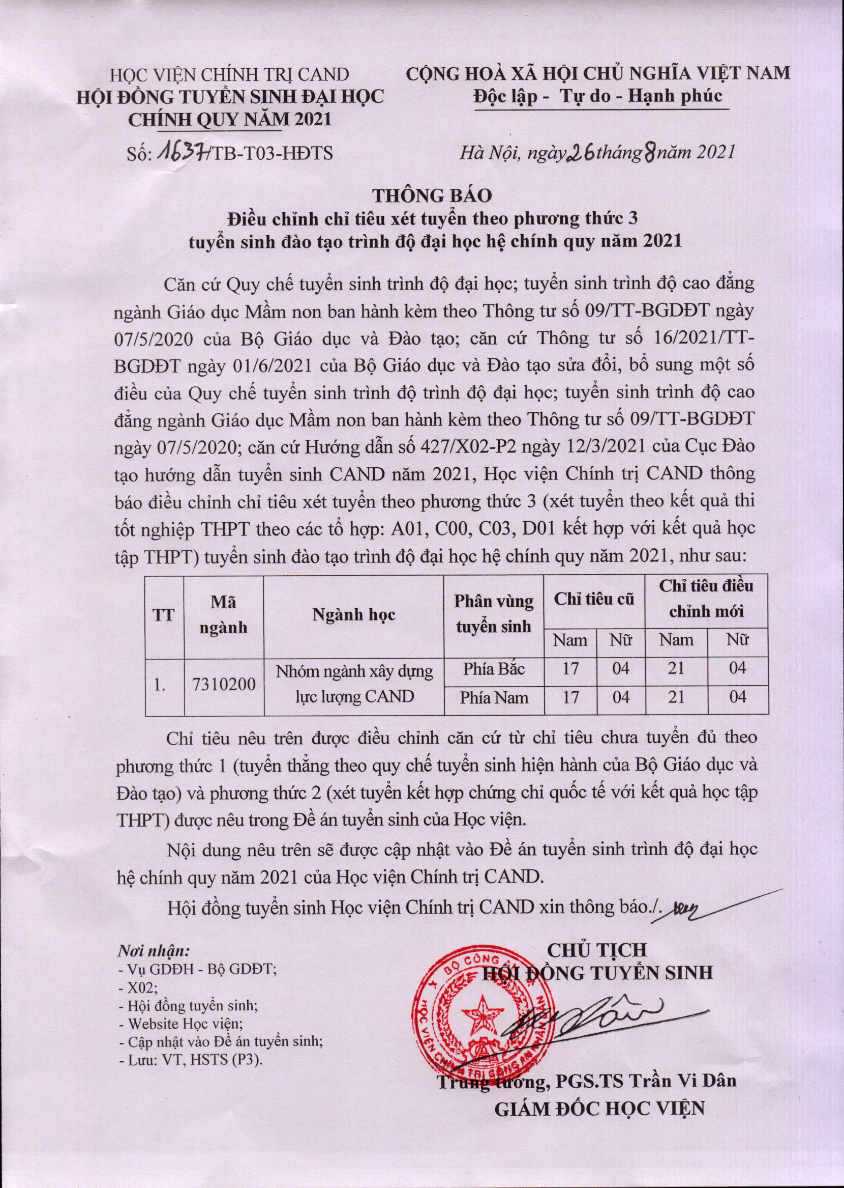 Học viện Chính trị Công an nhân thông báo điều chỉnh chỉ tiêu xét tuyển theo phương thức 3 tuyển sinh đào tạo trình độ đại học hệ chính quy năm 2021