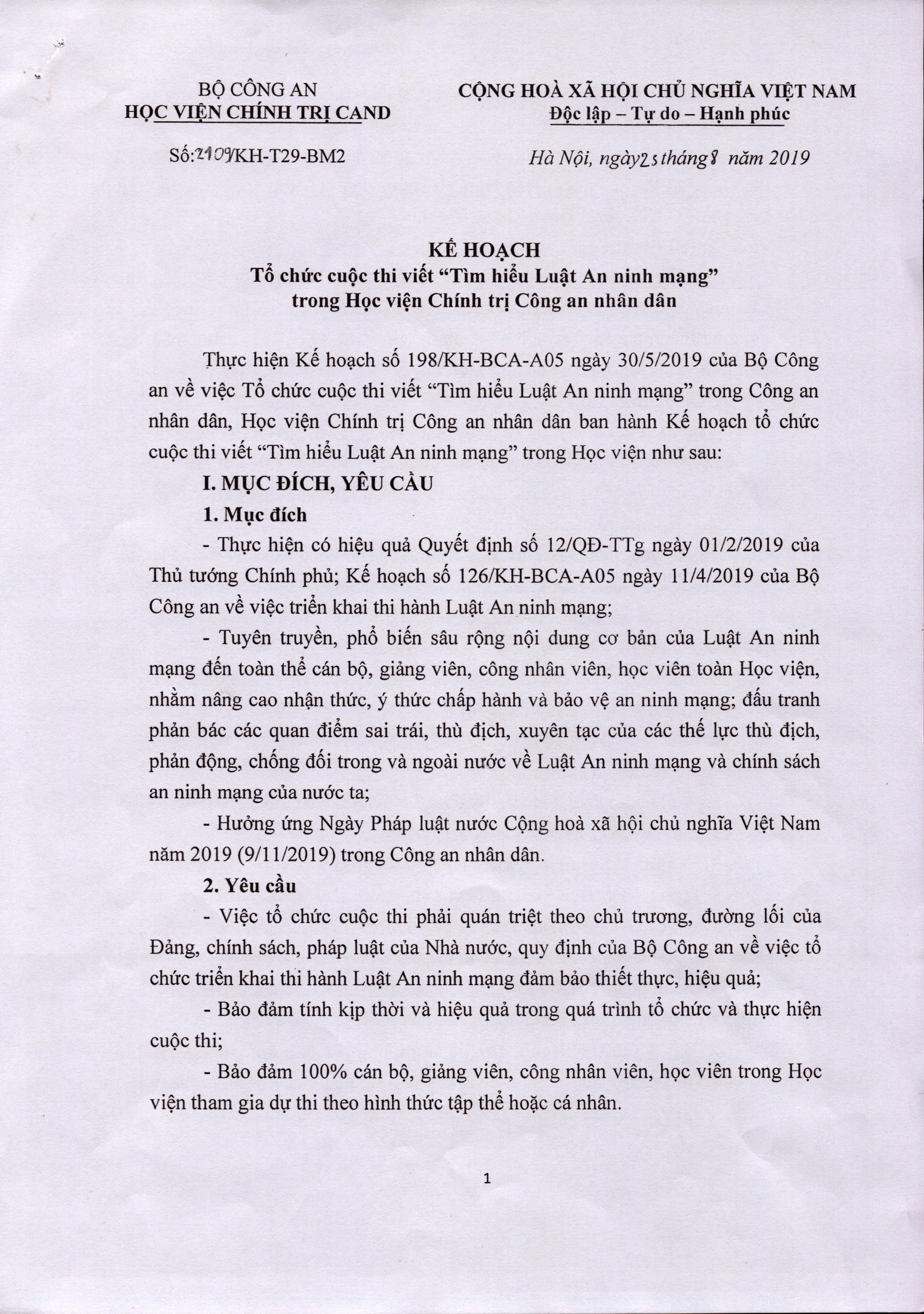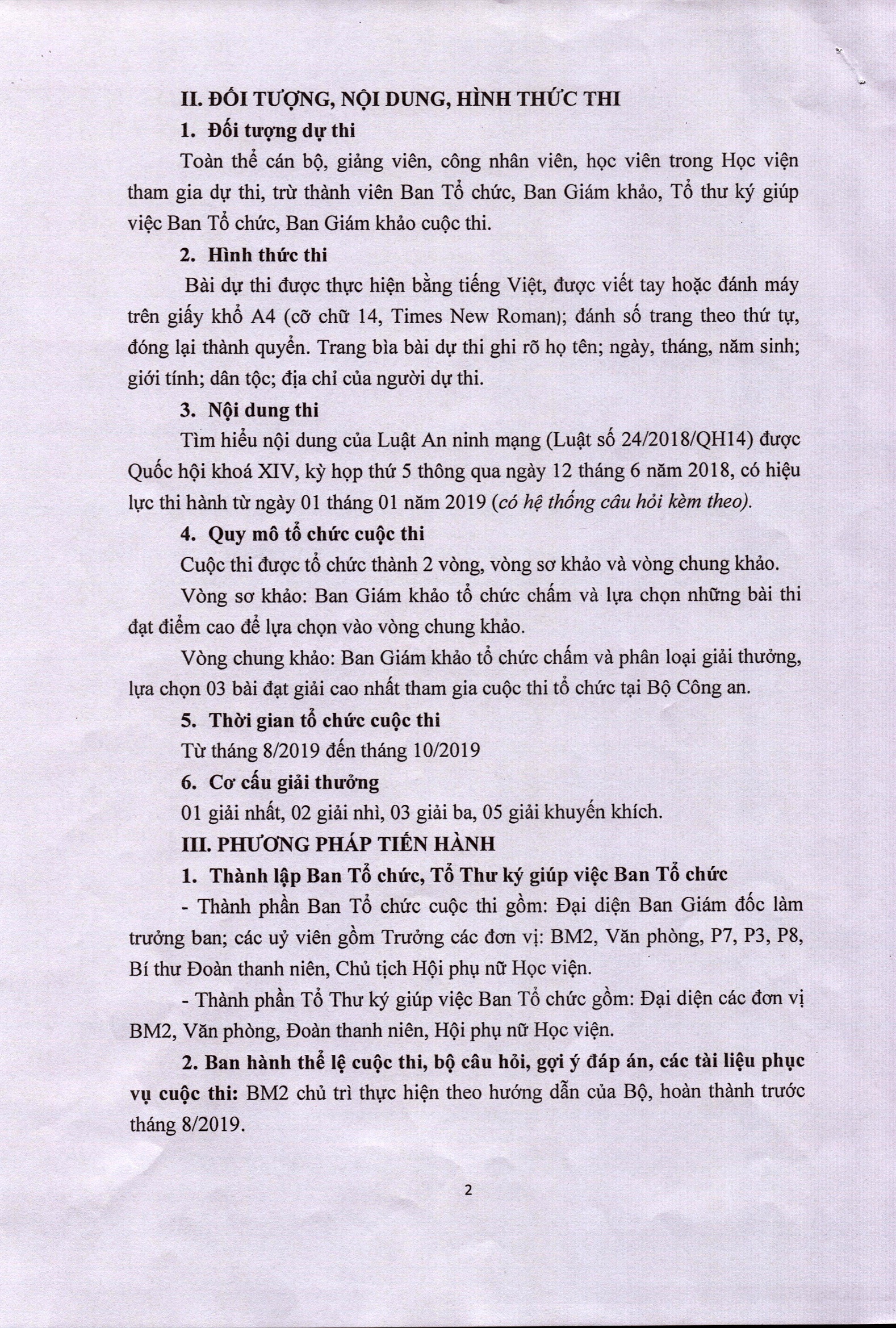 Kế hoạch tổ chức cuộc thi viết "Tìm hiểu luật An ninh mạng" trong Học viện Chính trị Công an nhân dân
