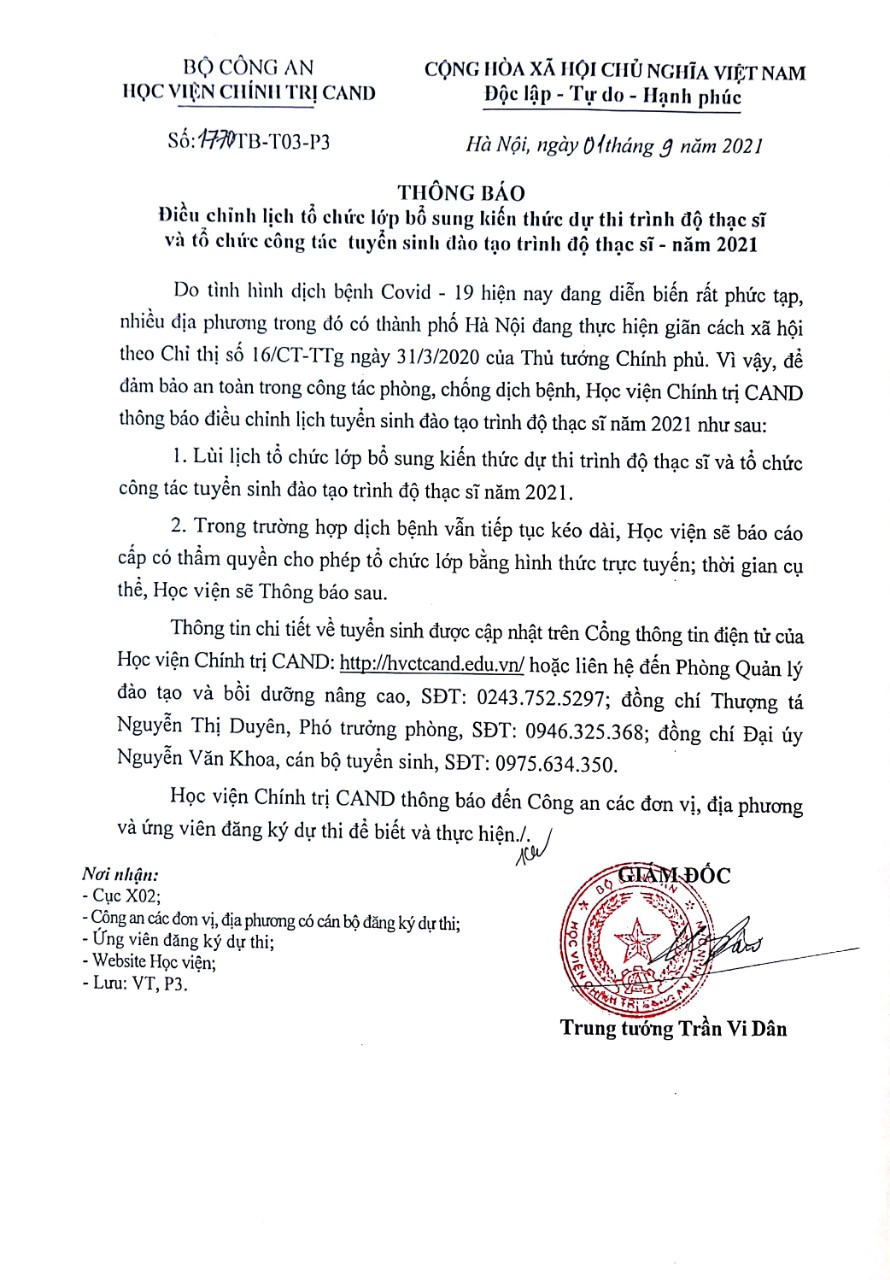 Thông báo điều chỉnh lịch tổ chức lớp bổ sung kiến thức dự thi trình độ thạc sĩ và tổ chức công tác tuyển sinh đào tạo trình độ thạc sĩ - năm 2021
