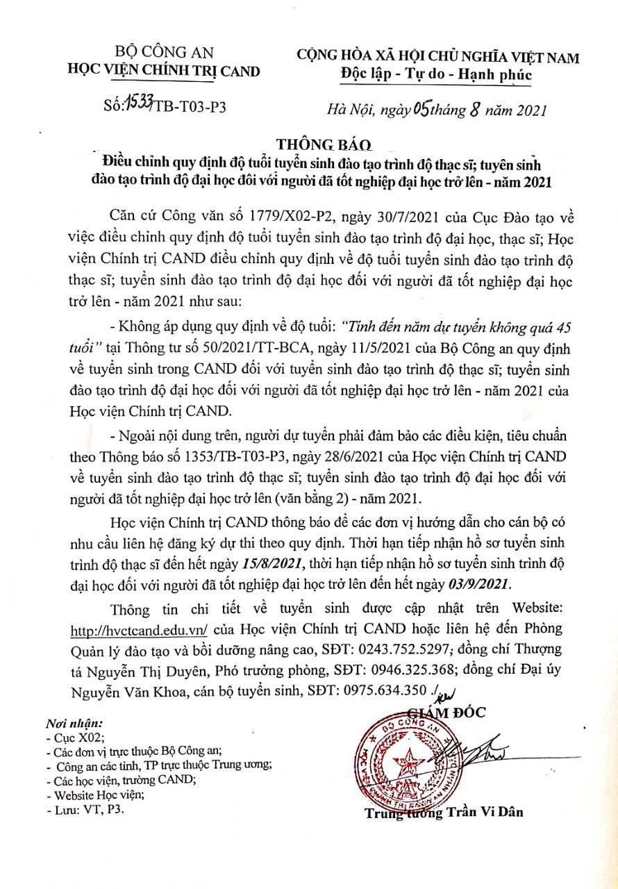 Thông báo điều chỉnh quy định độ tuổi tuyển sinh đào tạo trình độ thạc sĩ; tuyển sinh đào tạo trình độ đại học đối với người đã tốt nghiệp đại học trở lên - năm 2021