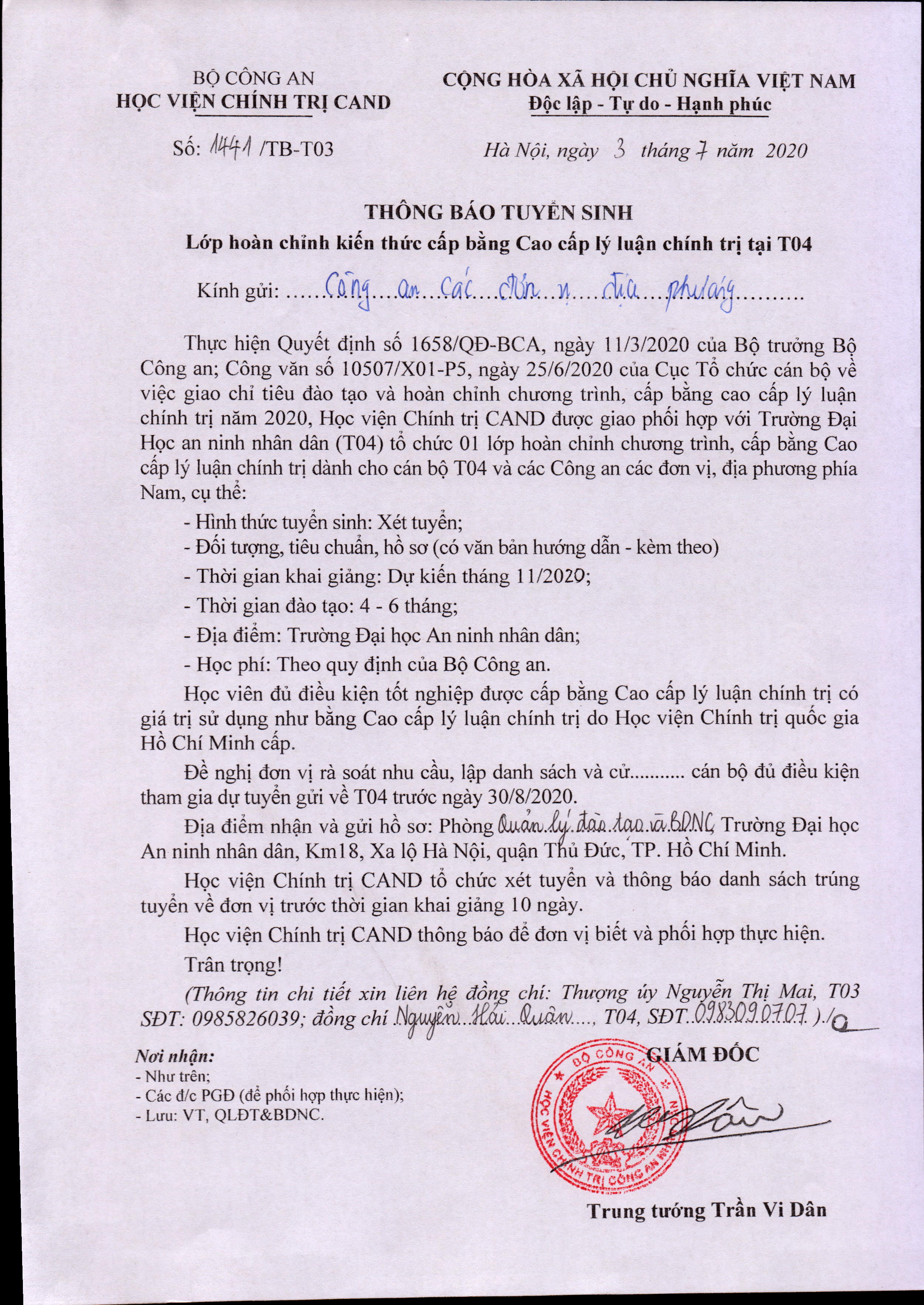 Thông báo tuyển sinh Lớp đào tạo cấp bằng Cao cấp lý luận chính trị (Hệ tập trung) mở tại Học viện Chính trị Công an nhân dân - Năm 2020