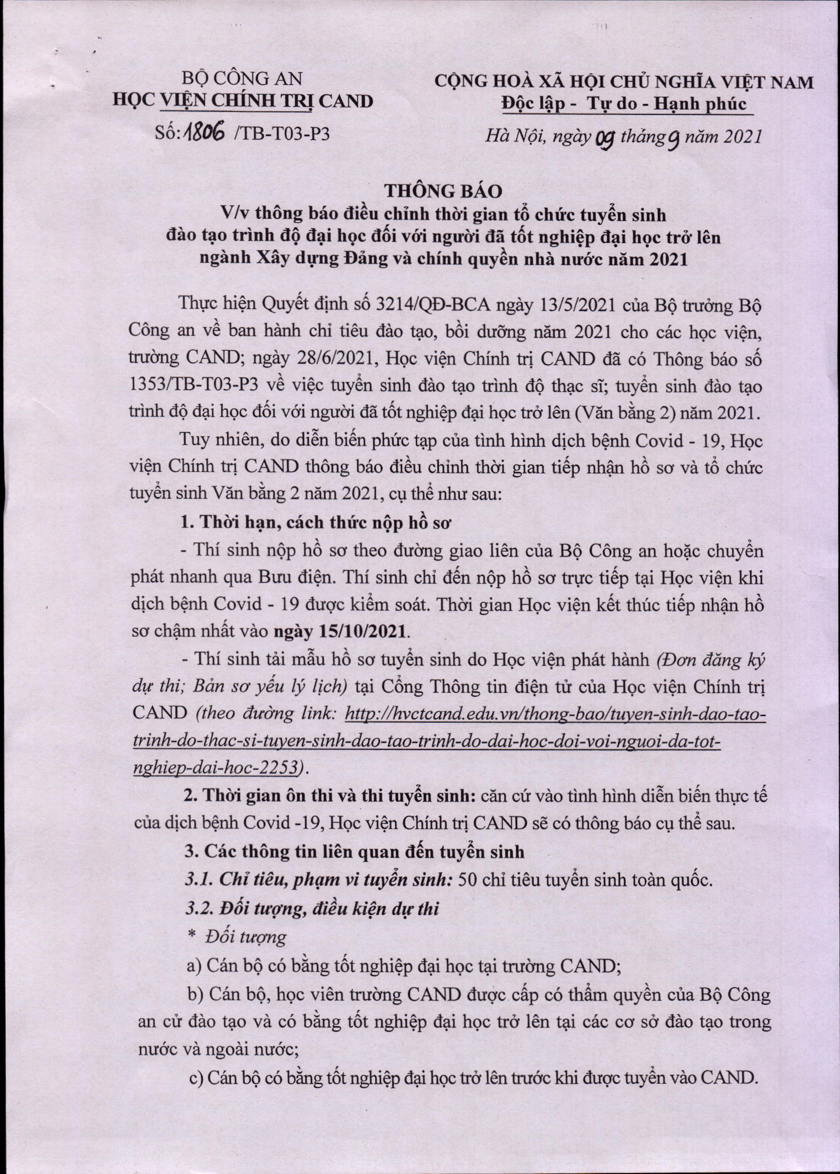 Thông báo về việc điều chỉnh thời gian tổ chức tuyển sinh đào tạo trình độ đại học đối với người đã tốt nghiệp đại học trở lên ngành Xây dựng Đảng và chính quyền nhà nước năm 2021