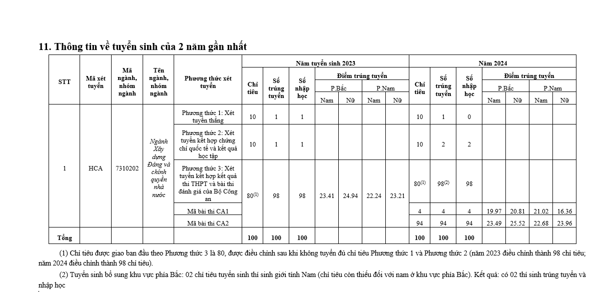 - Phương thức 1: Tuyển thẳng theo quy chế tuyển sinh hiện hành của Bộ GD&ĐT và quy định của Bộ Công an.