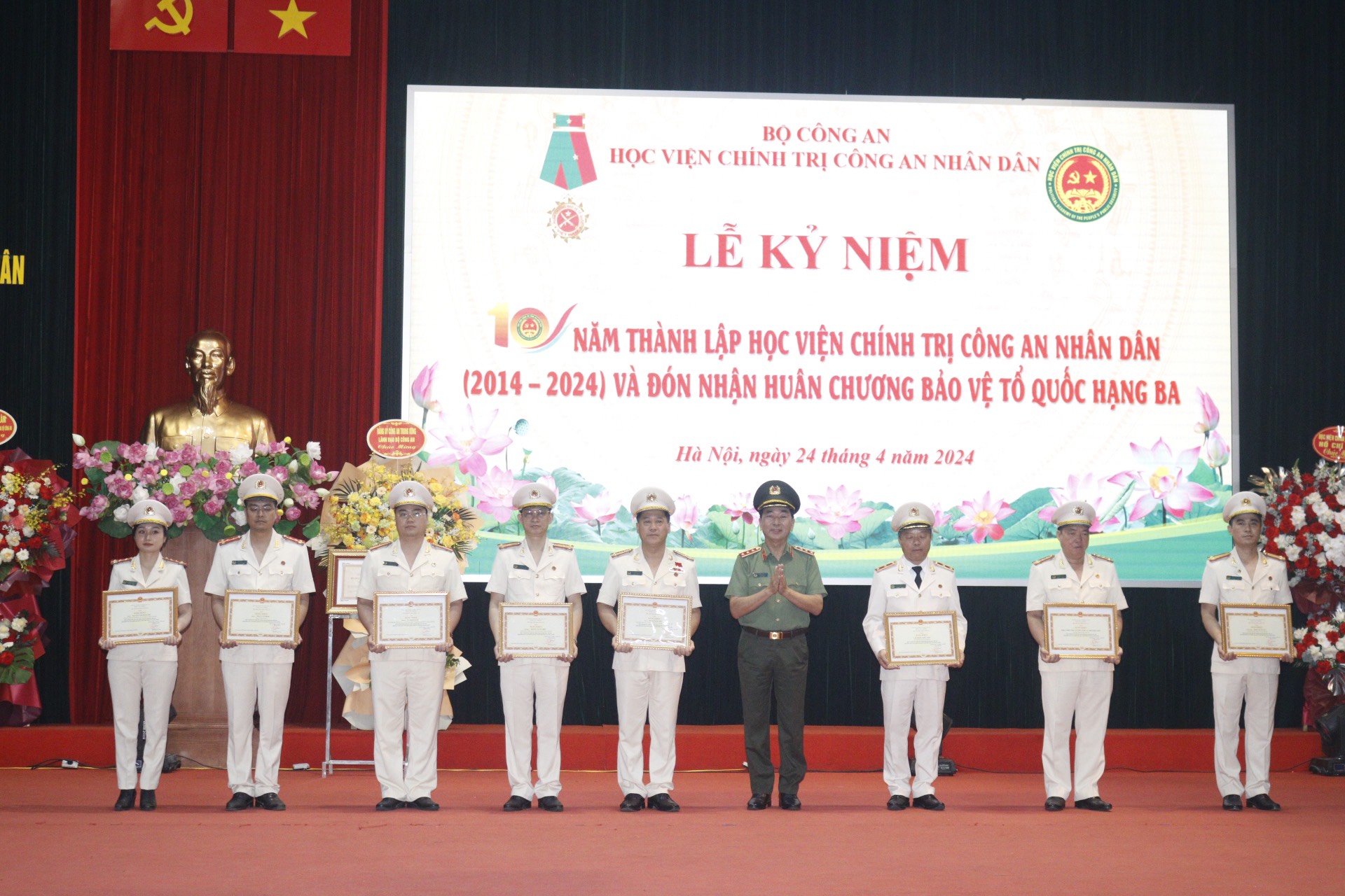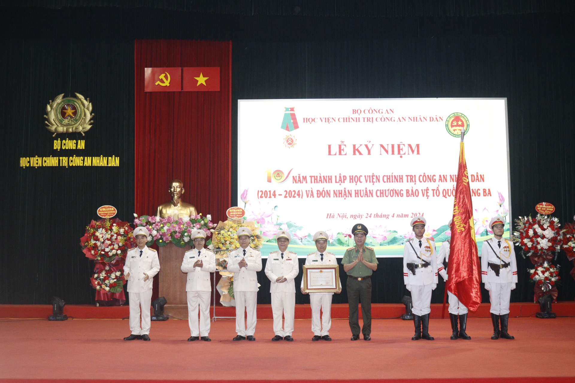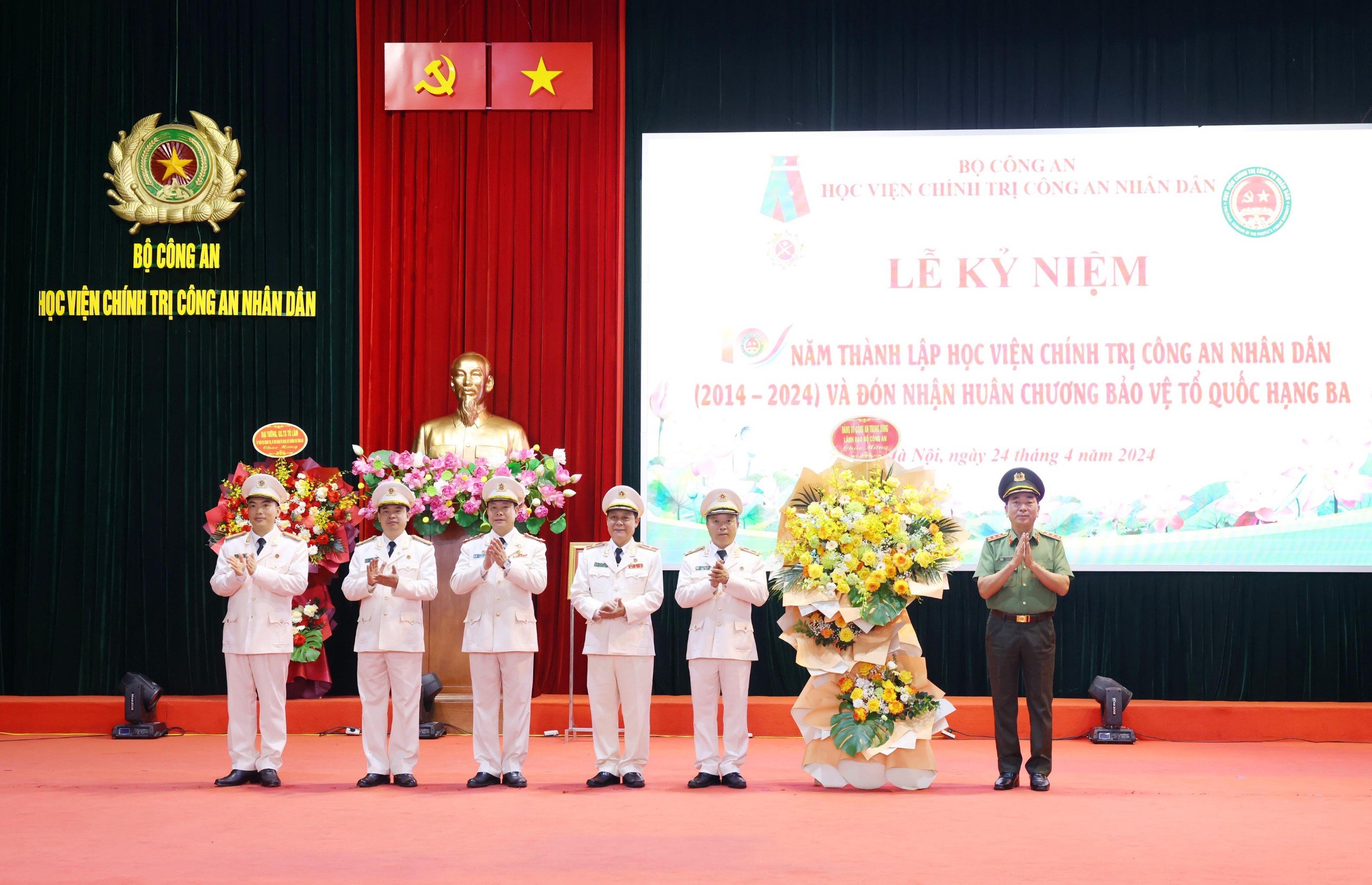 Chiều 24/4/2024, Học viện Chính trị Công an nhân dân kỷ niệm 10 năm thành lập và đón nhận Huân chương Bảo vệ Tổ quốc hạng Ba. Đồng chí Thượng tướng, PGS.TS Trần Quốc Tỏ, Ủy viên Trung ương Đảng, Phó Bí thư Đảng ủy CATW, Thứ trưởng Bộ Công an dự và phát biểu chỉ đạo. Nhân dịp này, Đại tướng, GS.TS Tô Lâm, Ủy viên Bộ Chính trị, Bộ trưởng Bộ Công an gửi lẵng hoa chúc mừng.