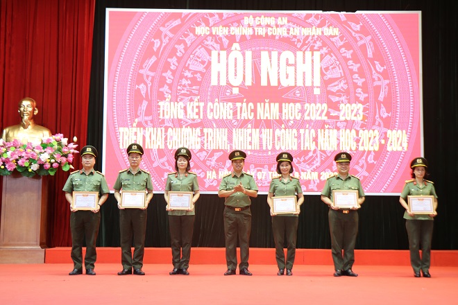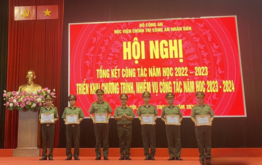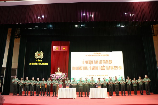 Nhân dịp này, Học viện đã trao tặng danh hiệu thi đua và Giấy khen cho các tập thể, cá nhân có thành tích xuất sắc trong phong trào thi đua năm học 2022-2023; đồng thời tổ chức lễ phát động và ký giao ước thi đua phong trào thi đua “Vì an ninh tổ quốc” năm học 2023-2024 trong toàn Học viện.