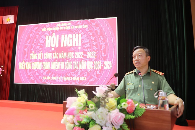 Thay mặt Đảng ủy, Ban Giám đốc Học viện, đồng chí Thiếu tướng, TS Nguyễn Như Lôi, Phó Giám đốc Học viện trình bày tóm tắt Báo cáo một số kết quả trọng tâm công tác năm học 2022-2023 và phương hướng, nhiệm vụ năm học 2023-2024. Theo đó, năm học 2022-2023 là thời điểm lực lượng CAND nói chung và Học viện Chính trị CAND nói riêng tập trung thực hiện Nghị quyết số 12-NQ/TW ngày 16/3/2022 của Bộ Chính trị và Kế hoạch số 118-KH/ĐUCA của Đảng ủy Công an Trung ương về đẩy mạnh xây dựng lực lượng CAND thật sự trong sạch, vững mạnh, chính quy, tinh nhuệ, hiện đại, đáp ứng yêu cầu, nhiệm vụ trong tình hình mới; để thực hiện thành công nghị quyết, Đảng ủy, Ban Giám đốc Học viện đã chỉ đạo sát sao, xác định phương hướng, nhiệm vụ chiến lược cho Học viện trong những năm học tiếp theo. Đồng thời, tổ chức sơ kết quá trình thực hiện Nghị quyết đại hội Đảng bộ Học viện lần thứ II, nhiệm kỳ 2020-2025, qua đó nhìn lại những kết quả đạt được, những khó khăn, vướng mắc trong quá trình thực hiện và đề ra phương hướng của Học viện trong nửa nhiệm kỳ còn lại.