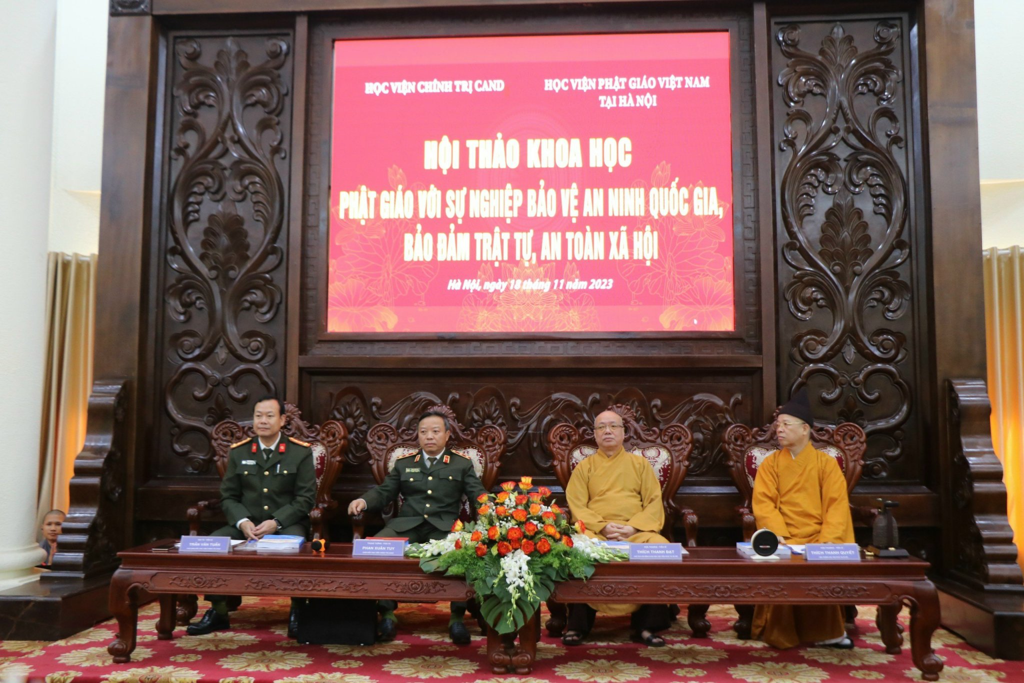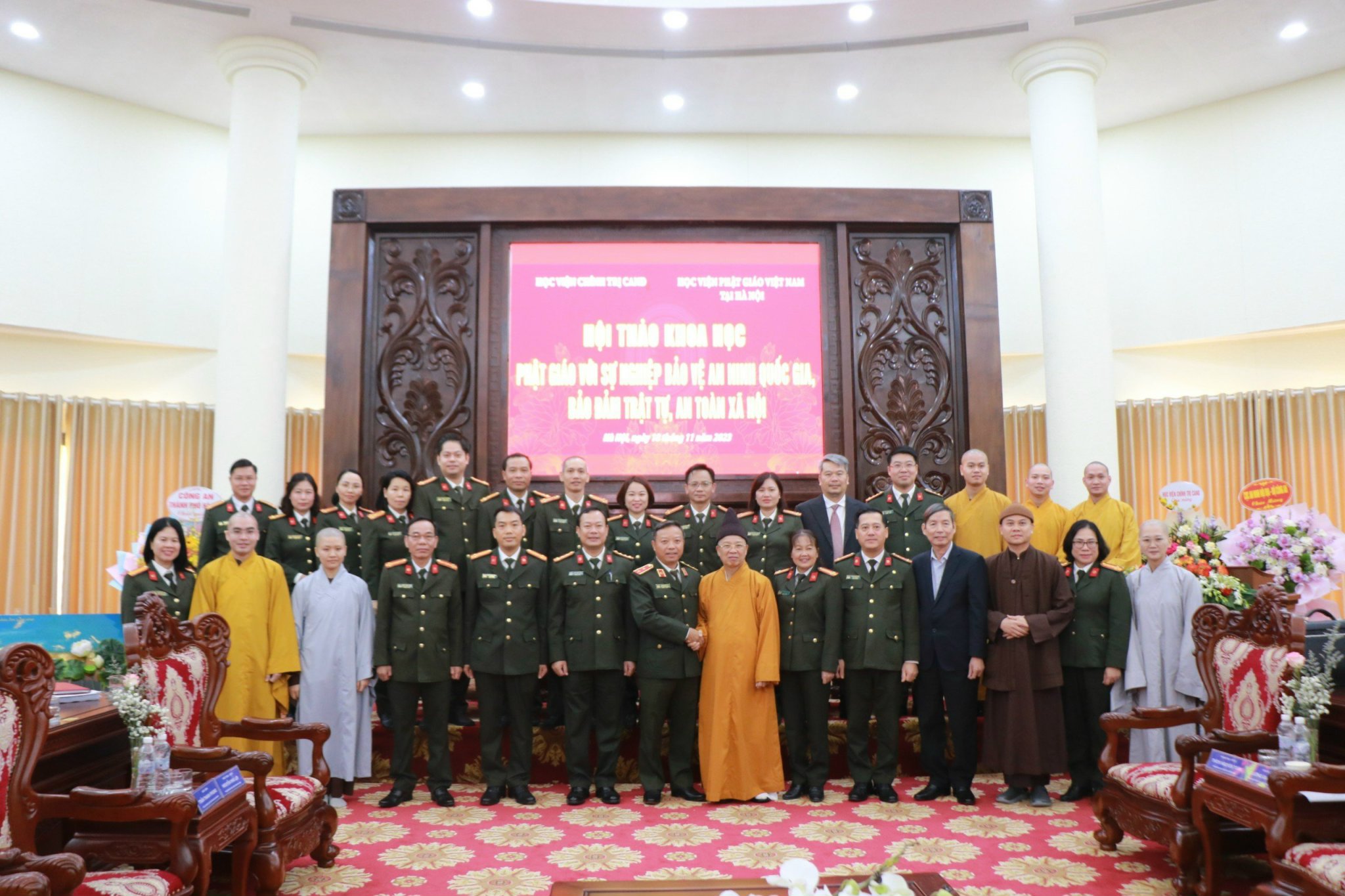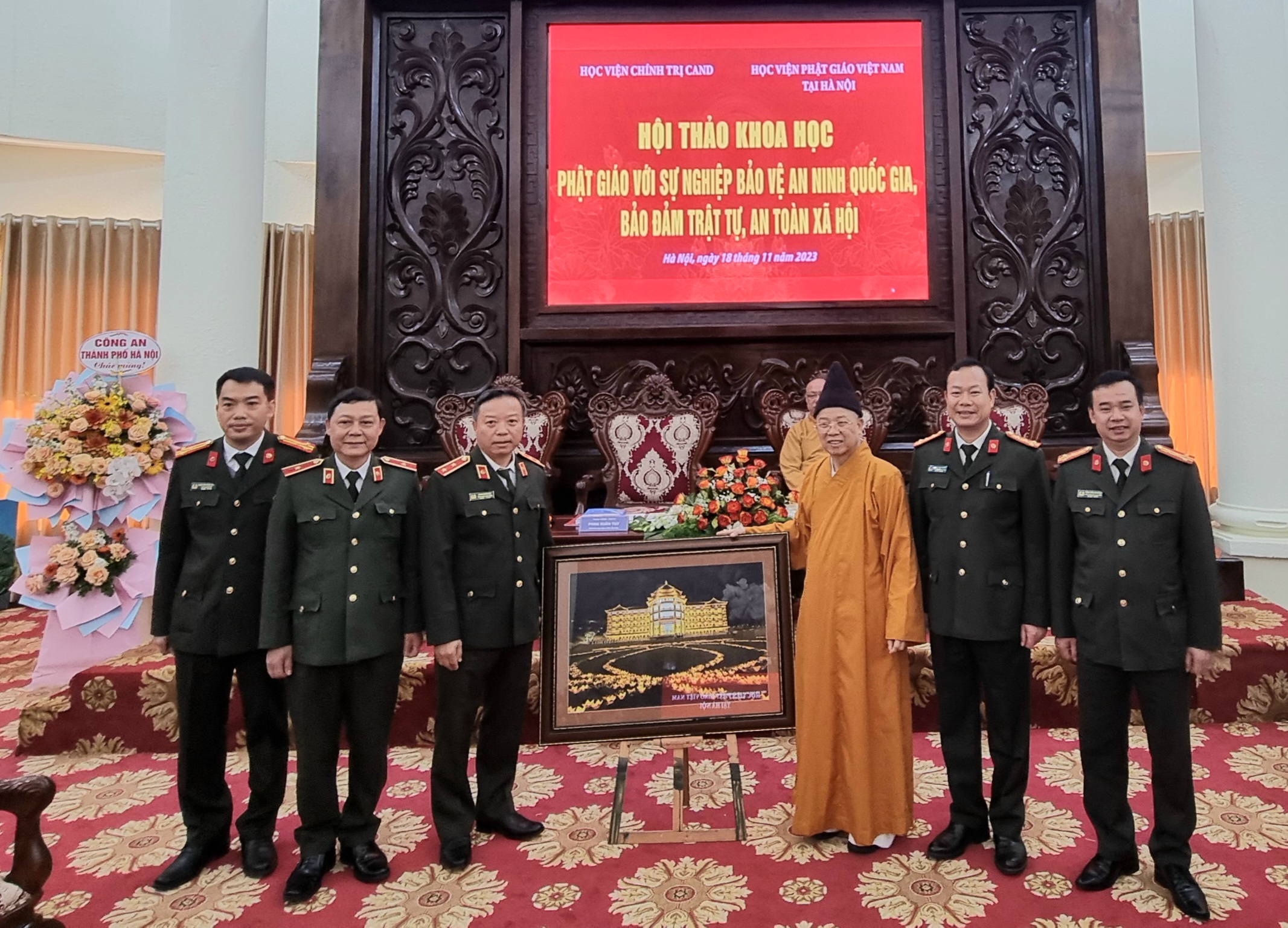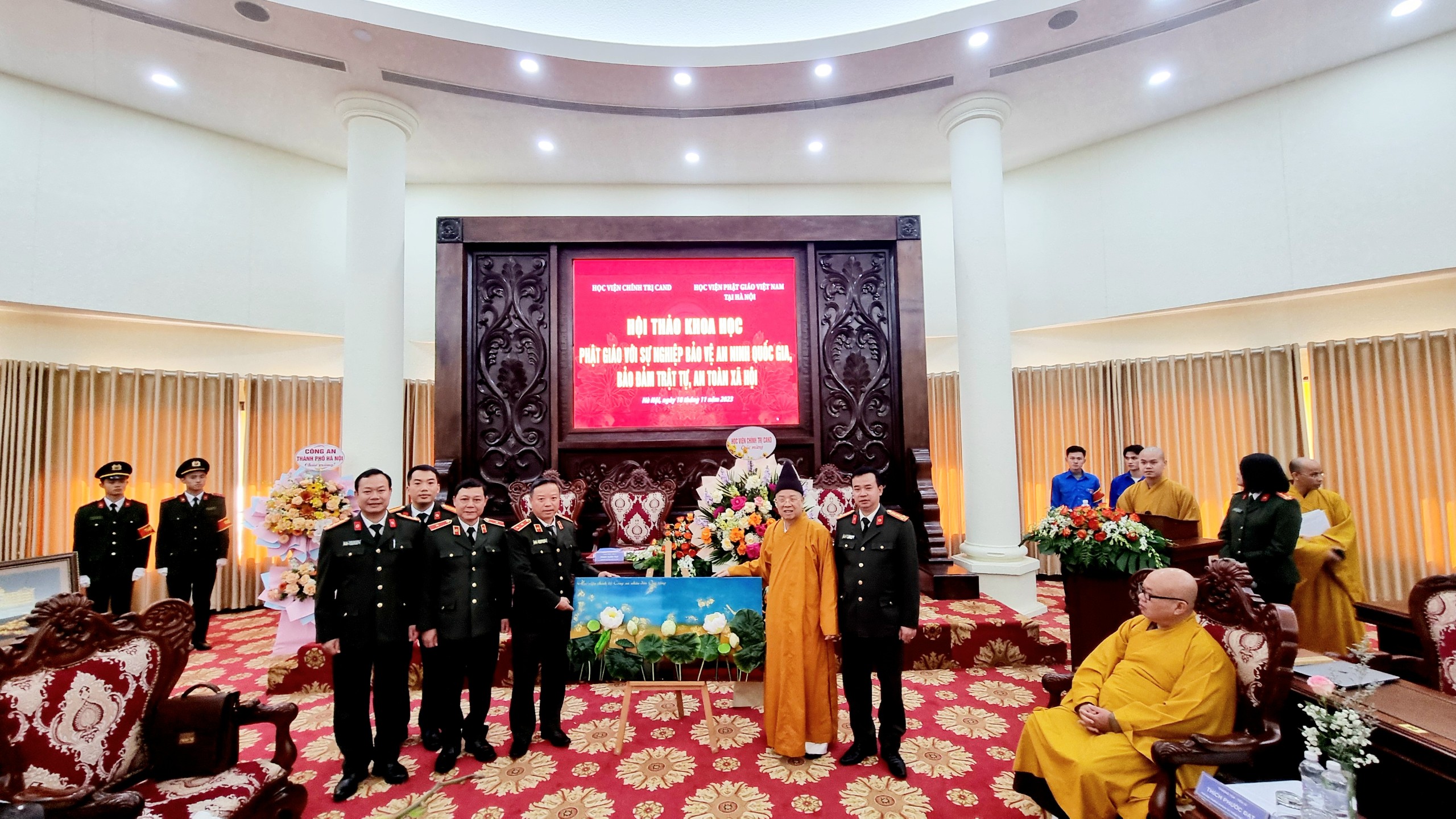 Quán triệt tư duy mới của Đảng, chính sách pháp luật Nhà nước, vì mục tiêu bảo vệ vững chắc an ninh quốc gia, trật tự, an toàn xã hội, xây dựng một nước Việt Nam xã hội chủ nghĩa, dân giàu, nước mạnh, dân chủ, công bằng, văn minh, sáng ngày 18/11/2023, tại Học viện Phật giáo Việt Nam tại Hà Nội, Học viện Chính trị Công an nhân dân và Học viện Phật giáo Việt Nam tại Hà Nội đã phối hợp tổ chức Hội thảo khoa học cấp Học viện, với chủ đề: “Phật giáo với sự nghiệp bảo vệ an ninh quốc gia, bảo đảm trật tự, an toàn xã hội.”. Đây là hoạt động thiết thực kỷ niệm Ngày đại đoàn kết toàn dân tộc 18/11 và chào mừng ngày Nhà giáo Việt Nam 20/11. Hội thảo nhằm mục đích: Làm rõ cơ sở lý luận, cơ sở thực tiễn và tầm quan trọng của Phật giáo với sự nghiệp bảo vệ an ninh quốc gia, bảo đảm trật tự, an toàn xã hội. Từ kết quả cuộc Hội thảo sẽ làm căn cứ để đề xuất phương hướng, giải pháp, kiến nghị với Bộ Công an, Công an các đơn vị, địa phương, các cơ quan ban, ngành, Mặt trận Tổ quốc các cấp để tiếp tục xác định, củng cố và phát huy sức mạnh của khối đại đoàn kết toàn dân tộc, trong đó có Phật giáo đối với sự nghiệp bảo vệ an ninh quốc gia, bảo đảm trật tự an toàn xã hội và vai trò nòng cốt của lực lượng Công an nhân dân trong bảo vệ an ninh trật tự, góp phần xây dựng và bảo vệ Tổ quốc Việt Nam xã hội chủ nghĩa.