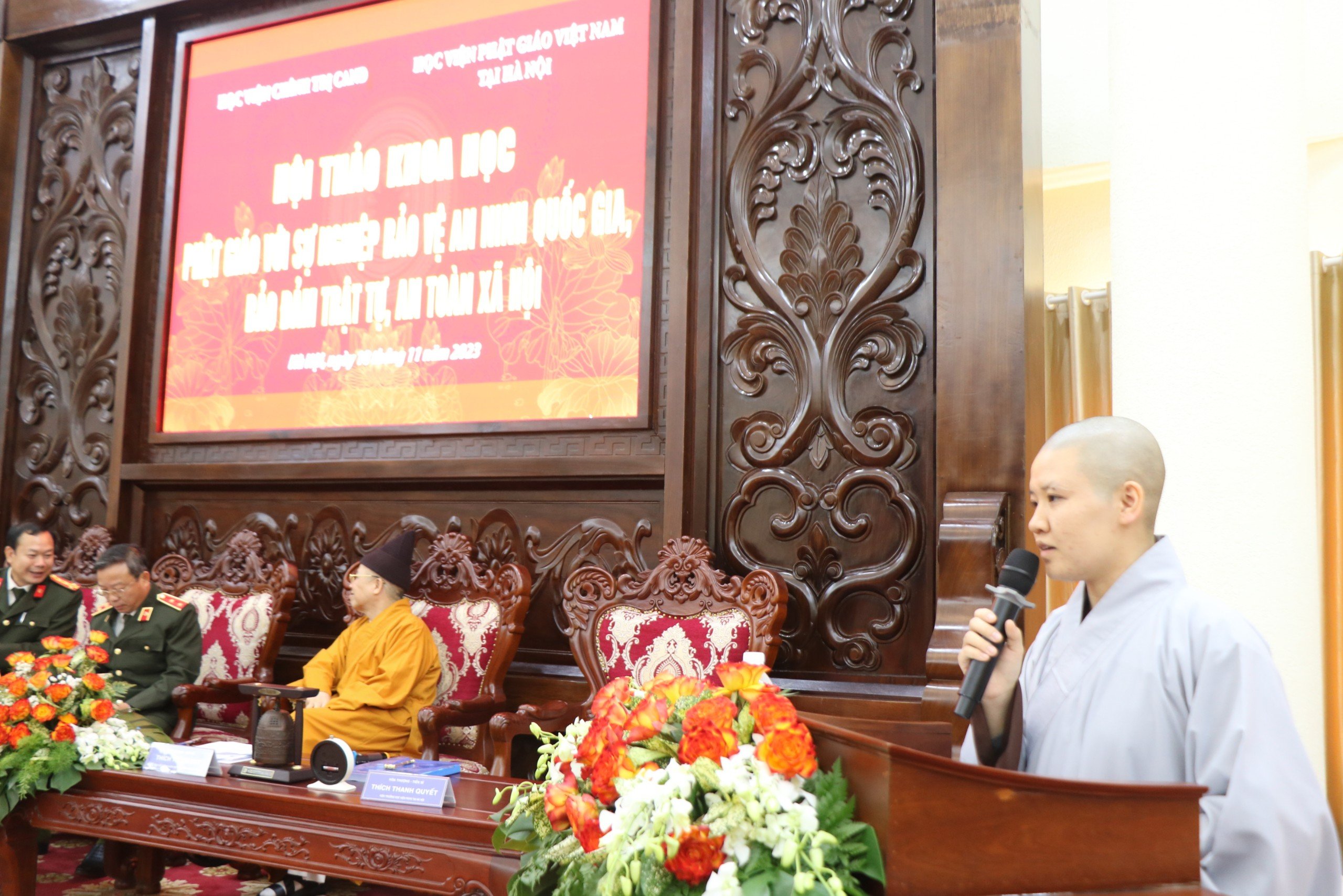Tham luận tại Hội thảo, các ý phát biểu đã làm rõ hơn chủ đề Hội thảo trên phương diện lý luận và thực tiễn về vị trí, vai trò, sự đồng hành của Phật giáo đối với sự nghiệp xây dựng và bảo vệ Tổ quốc và vai trò, trách nhiệm nòng cốt của lực lượng CAND trong bảo vệ ANTT. Từ đó chỉ ra những biện pháp, giải pháp tiếp tục phát huy vai trò của đội ngũ tăng, ni, phật tử trong việc xây dựng khối đại đoàn kết toàn dân, xây dựng thế trận lòng dân trong sự nghiệp bảo vệ an ninh quốc gia, bảo đảm trật tự an toàn xã hội trong giai đoạn hiện nay theo quan điểm, chủ trương của Đảng, chính sách, pháp luật Nhà nước ta.