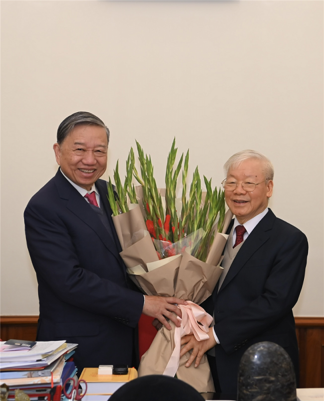 Nhân dịp Tết cổ truyền Quý Mão 2023, ngày 19/1 tại Hà Nội, Ban Thường vụ Đảng ủy Công an Trung ương, lãnh đạo Bộ Công an do Đại tướng Tô Lâm, Ủy viên Bộ Chính trị, Bí thư Đảng ủy Công an Trung ương, Bộ trưởng Bộ Công an dẫn đầu đã đến thăm, chúc Tết Tổng Bí thư Nguyễn Phú Trọng.