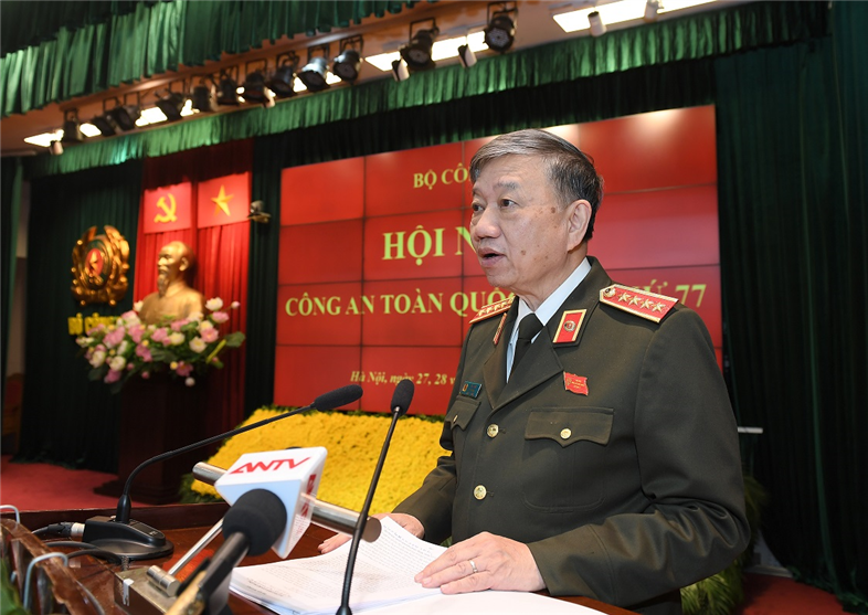 Phát biểu kết luận Hội nghị, thay mặt Đảng ủy Công an Trung ương, lãnh đạo Bộ Công an, Bộ trưởng Tô Lâm ghi nhận, đánh giá cao nỗ lực, cố gắng và những hy sinh to lớn của cán bộ, chiến sỹ trong toàn lực lượng; nhiệt liệt biểu dương kết quả, chiến công, thành tích xuất sắc trên các lĩnh vực công tác lực lượng CAND đạt được trong năm 2021 vừa qua.