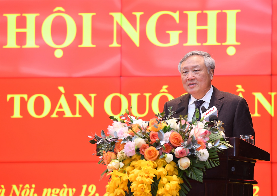Đồng chí Nguyễn Hòa Bình, Ủy viên Bộ Chính trị, Chánh án Tòa án nhân dân tối cao phát biểu tại Hội nghị.