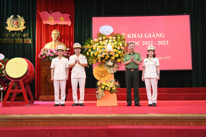 Đồng chí Bộ trưởng cũng bày tỏ tin tưởng, phát huy kết quả và những thành tích đạt được trong năm học 2021-2022, thầy và trò Trường Văn hoá sẽ vượt qua mọi khó khăn, thi đua lập nhiều thành tích, hoàn thành thắng lợi chương trình công tác năm học 2022-2023, góp phần xây dựng mối quan hệ gắn bó máu thịt giữa lực lượng Công an 3 nước Việt Nam-Lào và Campuchia.