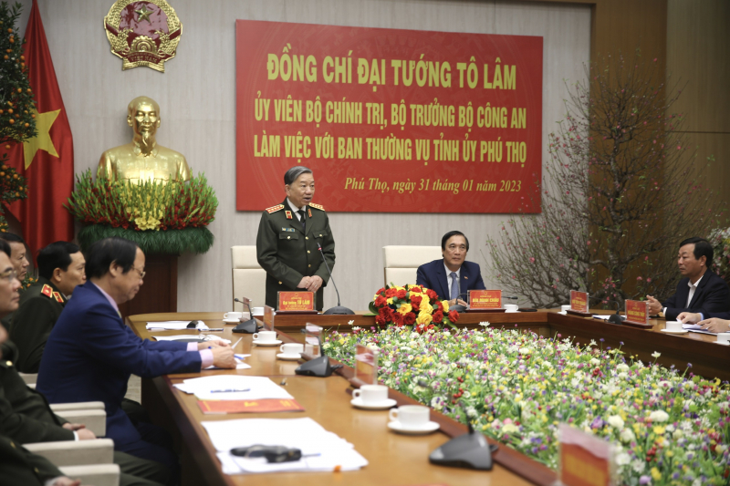 Về một số nhiệm vụ trọng tâm thời gian tới, Bộ trưởng Tô Lâm đề nghị cấp ủy, chính quyền các cấp tỉnh Phú Thọ tiếp tục triển khai thực hiện hiệu quả Nghị quyết 11 ngày 10/2/2022 của Bộ Chính trị về phương hướng phát triển kinh tế - xã hội, đảm bảo quốc phòng, an ninh vùng Trung du và miền núi Bắc Bộ đến năm 2030, tầm nhìn đến năm 2045; đẩy mạnh cải cách hành chính, trọng tâm là thực hiện tốt Đề án số 06 của Chính phủ về phát triển ứng dụng dữ liệu dân cư, định danh và xác thực điện tử phục vụ chuyển đổi số quốc gia giai đoạn 2021 - 2025, tầm nhìn đến năm 2030...