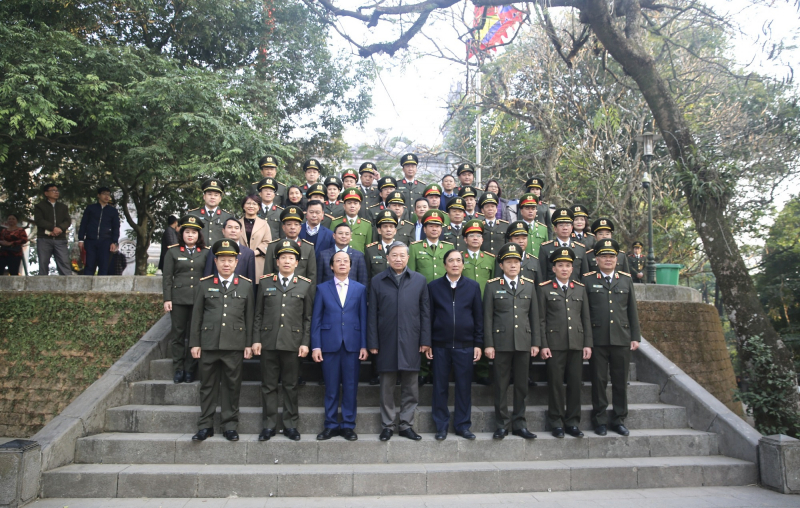 Bộ trưởng Tô Lâm và các đồng chí lãnh đạo Bộ Công an, Bộ Tài nguyên và Môi trường và lãnh đạo tỉnh Phú Thọ chụp ảnh lưu niệm tại Đền Thượng.