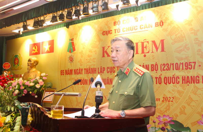 Thay mặt Đảng ủy Công an Trung ương, lãnh đạo Bộ Công an, Bộ trưởng Tô Lâm ghi nhận, đánh giá cao những công lao và thành tích của các thế hệ CBCS của Vụ Tổ chức cán bộ (nay là Cục Tổ chức cán bộ) trong sự nghiệp bảo vệ an ninh quốc gia, bảo đảm TTATXH và xây dựng lực lượng CAND trong sạch, vững mạnh suốt 65 năm qua. "Những thành tích của các đồng chí đã góp phần tô thắm truyền thống vẻ vang "CAND trung thành với Đảng - Vì nước quên thân - Vì dân phục vụ", củng cố niềm tin yêu và sự gắn bó của Nhân dân với lực lượng CAND trong sự nghiệp xây dựng và bảo vệ an ninh Tổ quốc", đồng chí Bộ trưởng biểu dương.
