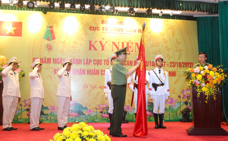 Thừa uỷ quyền của lãnh đạo Đảng, Nhà nước, Bộ trưởng Tô Lâm gắn Huân chương Bảo vệ Tổ quốc hạng Nhì lên Cờ truyền thống của Cục Tổ chức cán bộ.