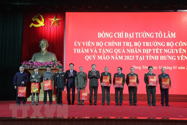 Nhân dịp Tết Nguyên đán Quý Mão 2023, chiều 11/1, Đại tướng Tô Lâm, Ủy viên Bộ Chính trị, Bộ trưởng Bộ Công an và Đoàn công tác đã đến chúc Tết, tặng quà gia đình chính sách, người có công và người lao động nghèo tại tỉnh Hưng Yên.