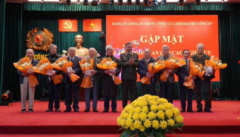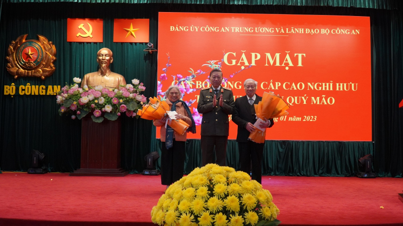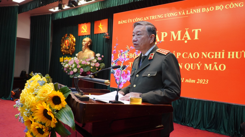 Ngày 6/1, Đảng ủy Công an Trung ương, lãnh đạo Bộ Công an tổ chức gặp mặt, chúc Tết cán bộ Công an cấp cao nghỉ hưu nhân dịp Tết Nguyên đán Qúy Mão 2023 tại TP Hà Nội. Đại tướng Tô Lâm, Ủy viên Bộ Chính trị, Bí thư Đảng ủy Công an Trung ương, Bộ trưởng Bộ Công an chủ trì buổi gặp mặt.