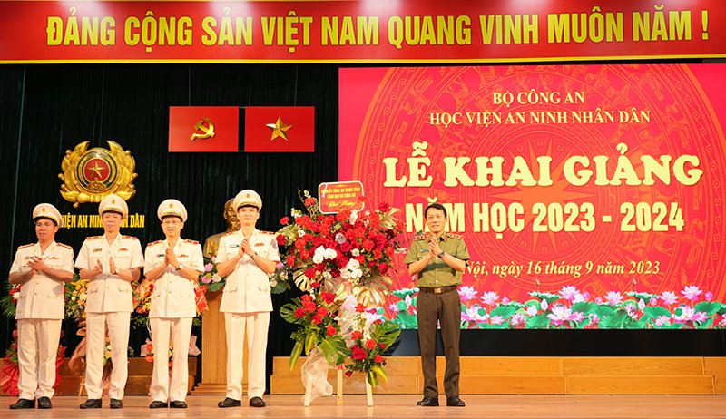 Thứ trưởng Lương Tam Quang tặng hoa chúc mừng Học viện ANND nhân dịp khai giảng năm học mới.