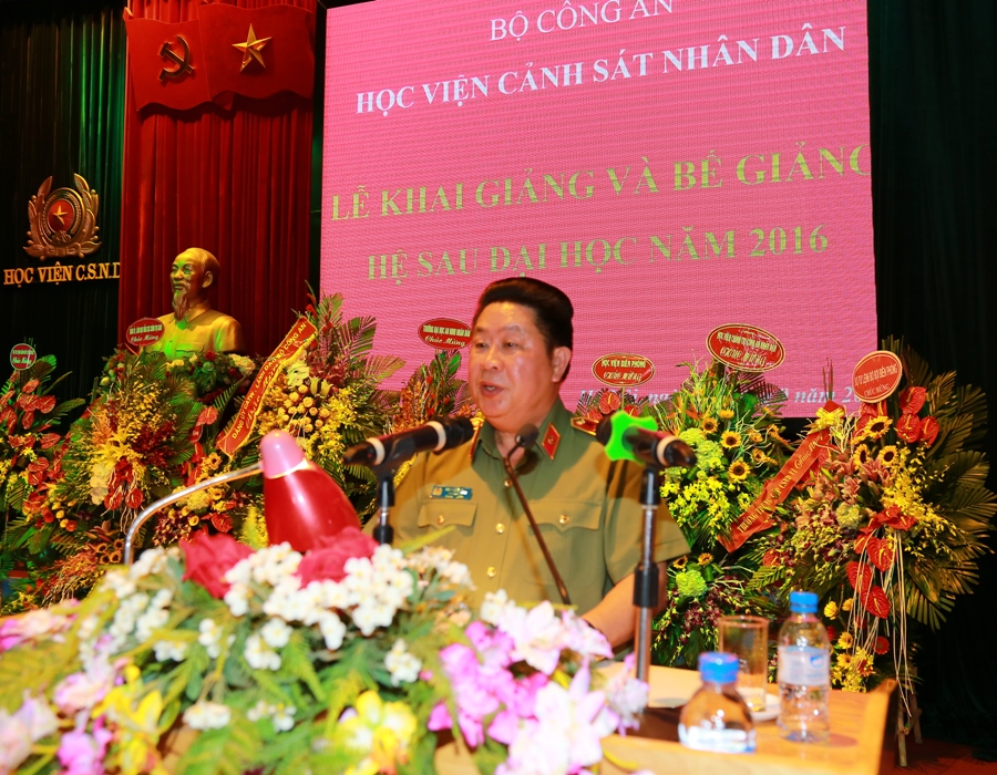 Đối với các tân học viên cao học trúng tuyển năm 2016 cần cố gắng nhiều hơn nữa, khắc phục những khó khăn, chủ động, sáng tạo để hoàn thành tốt nhiệm vụ học tập, nghiên cứu. Đối với các đồng chí nhận bằng Tiến sĩ, Thạc sĩ hôm nay, đồng chí Thứ trưởng biểu dương tinh thần học tập và ghi nhận những thành tích học tập, nghiên cứu đạt được trong khóa học; đồng thời, đề nghị các tân Tiến sĩ, Thạc sĩ thời gian tới cần tích cực vận dụng những kiến thức, kết quả nghiên cứu đã đạt được để đánh giá, dự báo và đề xuất những biện pháp, đối sách giải quyết tốt những vấn đề mới phát sinh trong thực tiễn đấu tranh phòng, chống tội phạm, vi phạm pháp luật, giữ gìn trật tự, an toàn xã hội.