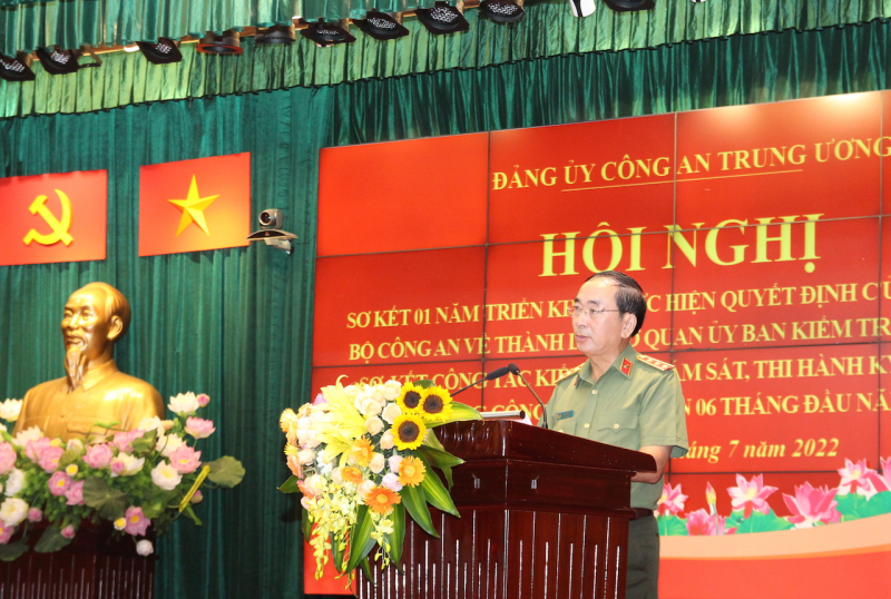 Sáng 18/7, tại Hà Nội, Đảng ủy Công an Trung ương tổ chức Hội nghị trực tuyến sơ kết 1 năm thực hiện Quyết định của Bộ trưởng Bộ Công an về thành lập Cơ quan Ủy ban Kiểm tra (UBKT) các cấp và sơ kết công tác kiểm tra, giám sát, thi hành kỷ luật đảng 6 tháng đầu năm 2022 trong CAND.