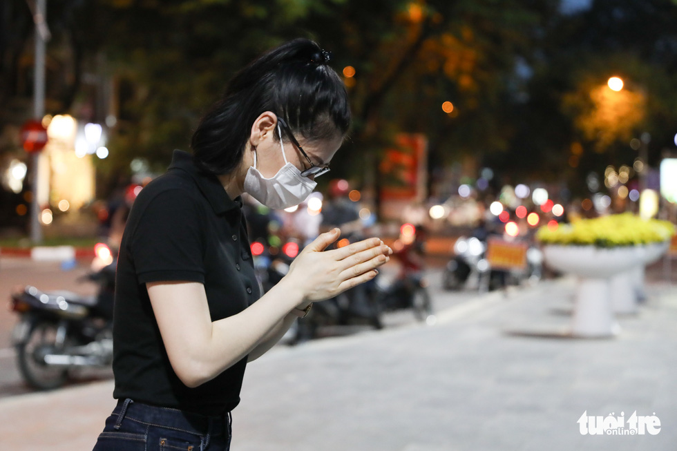 Chị Thu Hà ( Đống Đa, Hà Nội) đứng trước tượng đài "Công an nhân dân vì dân phục vụ" để cầu nguyện cho ba chiến sĩ cảnh sát phòng cháy chữa cháy đã hy sinh - Ảnh: DANH KHANG