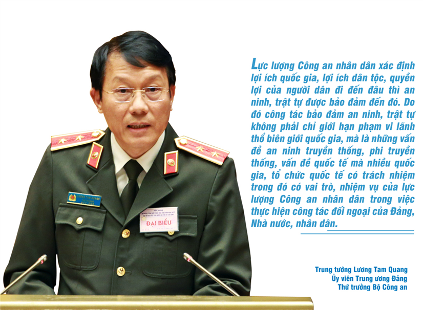 Lực lượng Công an đã tích cực tham gia hoạt động đối ngoại của đất nước nhằm bảo đảm cao nhất lợi ích quốc gia dân tộc và an ninh quốc gia. Thu thập thông tin và thường xuyên có báo cáo với Đảng, Nhà nước, trao đổi với các bộ, ngành liên quan về những xu hướng, vấn đề mới nổi lên trong quan hệ quốc tế, đề xuất kiến nghị các giải pháp nhằm giảm thiểu các nguy cơ tác động đến an ninh, lợi ích quốc gia Việt Nam; những kinh nghiệm, công nghệ, tri thức tiên tiến của nhân loại, góp phần hoạch định chính sách đối nội, đối ngoại, phát triển kinh tế - xã hội, ứng phó hiệu quả với các vấn đề an ninh truyền thống và phi truyền thống. Tích cực truyền tải những thông điệp về đường lối, chính sách đối ngoại của Đảng, Nhà nước, đấu tranh, phản bác những luận điệu vu cáo, xuyên tạc về tình hình Việt Nam tại các diễn đàn, cơ chế đối thoại an ninh, góp phần giảm thiểu tác động can thiệp vào công việc nội bộ của Việt Nam của các thế lực thù địch, tăng cường sự đồng tình ủng hộ của nhiều nước trong bảo vệ an ninh chủ quyền biển, đảo và đấu tranh với hoạt động lợi dụng dân chủ, nhân quyền chống phá Việt Nam. Đồng thời, chủ động phát hiện, kiến nghị vấn đề, thời điểm truyền tải thông điệp cấp cao nhằm hóa giải nghi kỵ, củng cố lòng tin chiến lược với các đối tác. Bảo đảm an ninh chính trị nội bộ các cơ quan đại diện ngoại giao Việt Nam, công dân Việt Nam ở nước ngoài; hoạt động đối ngoại của lãnh đạo Đảng, Nhà nước, các hội nghị, đoàn khách quốc tế, cơ quan ngoại giao nước ngoài ở Việt Nam, góp phần nâng cao vị thế, tín nhiệm của Việt Nam trên trường quốc tế.