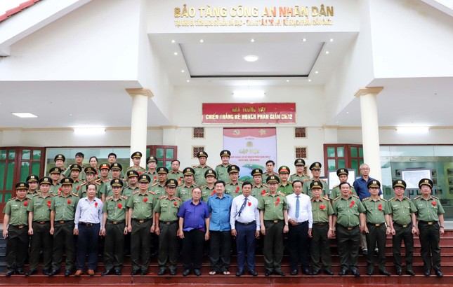 Các đại biểu tham dự chụp ảnh lưu niệm tại Nhà trưng bày chiến thắng Kế hoạch phản gián CM12.