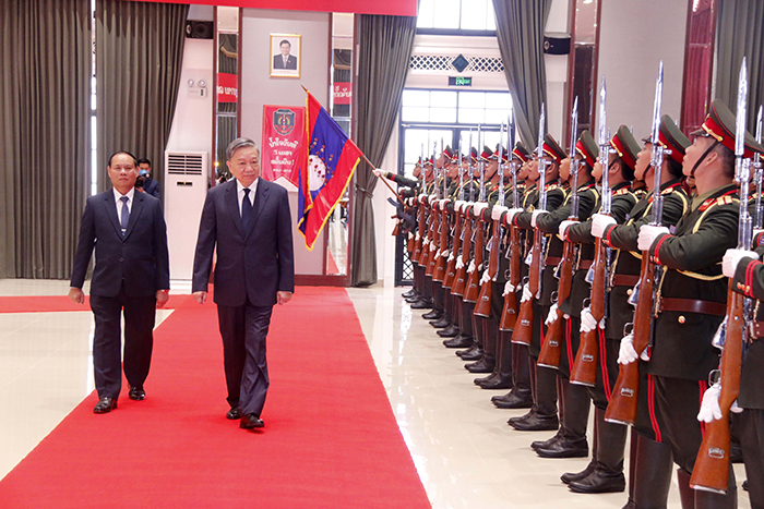 Nhận lời mời của Đại tướng Vilay Lakhamphong, Ủy viên Bộ Chính trị Đảng NDCM Lào, Phó Thủ tướng, Bộ trưởng Bộ Công an Lào, Đoàn đại biểu cấp cao Bộ Công an Việt Nam do Đại tướng Tô Lâm, Ủy viên Bộ Chính trị, Bộ trưởng Bộ Công an làm Trưởng đoàn đã sang thăm và làm việc tại CHDCND Lào.