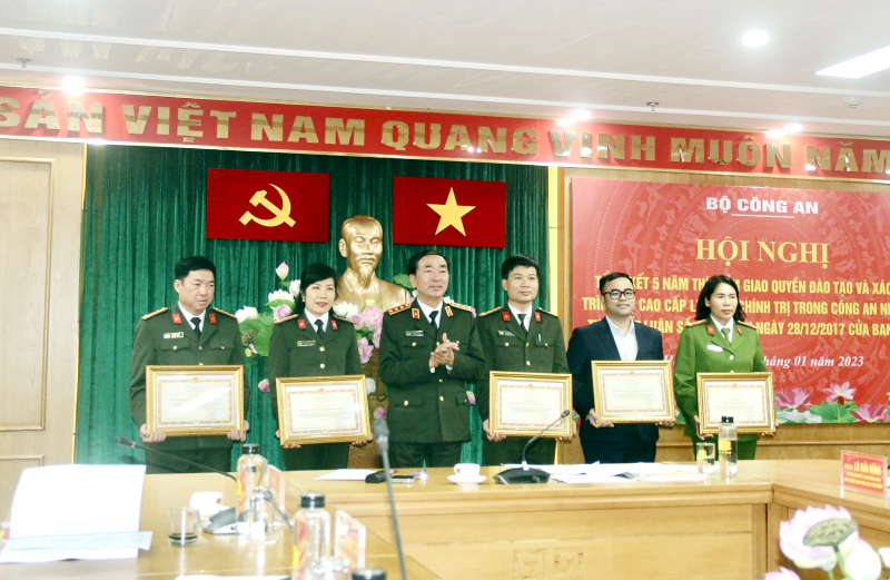 Thứ trưởng Trần Quốc Tỏ trao Bằng khen của Bộ trưởng Bộ Công an tặng các tập thể có thành tích xuất sắc trong tổng kết 5 năm thí điểm giao quyền đào tạo và xác nhận trình độ cao cấp lý luận chính trị trong CAND.