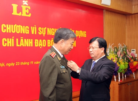 Bộ trưởng Bộ Xây dựng Trịnh Đình Dũng trao Kỷ niệm chương Vì sự nghiệp Xây dựng tặng Thứ trưởng Tô Lâm.