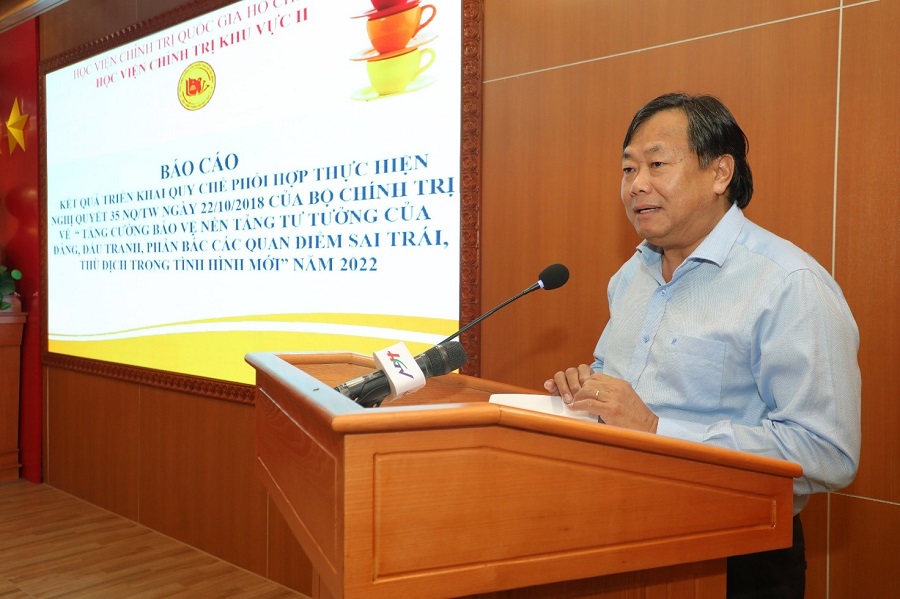 PGS, TS. Nguyễn Quốc Dũng, Ủy viên Ban Thường vụ Đảng ủy Học viện Chính trị quốc gia Hồ Chí Minh; Bí thư Đảng ủy, Giám đốc Học viện Chính trị Khu vực II; Thành viên Hội đồng Lý luận Trung ương; Trưởng Ban Chỉ đạo 35 Học viện Chính trị Khu vực II báo cáo tổng hợp kết quả triển khai Nghị quyết 35-NQ/TW năm 2022.
