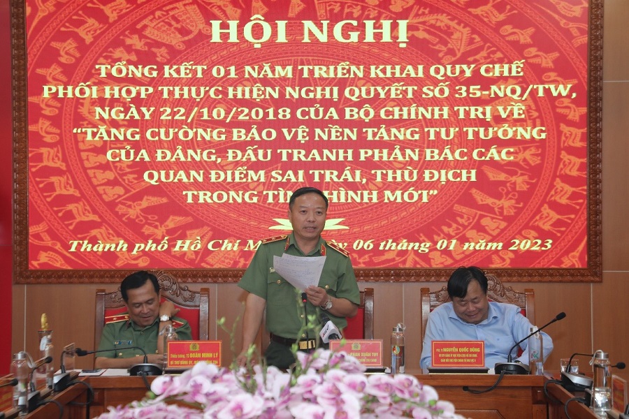 Phát biểu bế mạc Hội nghị, đồng chí Trung tướng, PGS, TS. Phan Xuân Tuy, Bí thư Đảng ủy, Giám đốc Học viện Chính trị Công an nhân dân; Thành viên Ban chỉ đạo 35 Bộ Công an khẳng định hội nghị đã thành công rất tốt đẹp. Hội nghị đã được tiếp thu nhiều ý kiến thực tế, từ đó chúng ta có thể xây dựng chương trình công tác năm tốt hơn, góp phần thực hiện tốt Quy chế phối hợp trong năm tiếp theo. Đồng chí Phan Xuân Tuy đã đề xuất các đơn vị cần xây dựng kế hoạch chung tổ chức thực hiện Quy chế phối hợp, căn cứ vào đó, hàng năm, đơn vị, địa phương chủ trì sẽ xây dựng kế hoạch cụ thể, xác định những nội dung trọng tâm phối hợp và chỉ tiêu công việc đặt ra; nghiên cứu thiết lập ngay cơ chế thông tin, trao đổi giữa các đơn vị thông qua không gian mạng để thời nắm bắt, trao đổi thông tin phối hợp; nghiên cứu, xây dựng nguồn kinh phí để thực hiện Quy chế phối hợp cho các hoạt động chung; chủ động công tác tuyên truyền, tiếp tục tổ chức tập huấn, hội thảo … nhằm nâng cao hiệu quả việc thực hiện Nghị quyết số 35-NQ/TW trong thời gian tới.